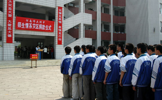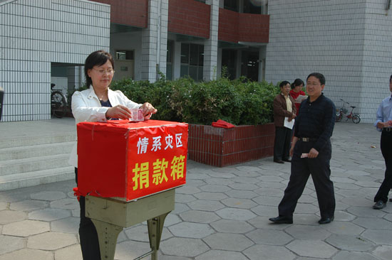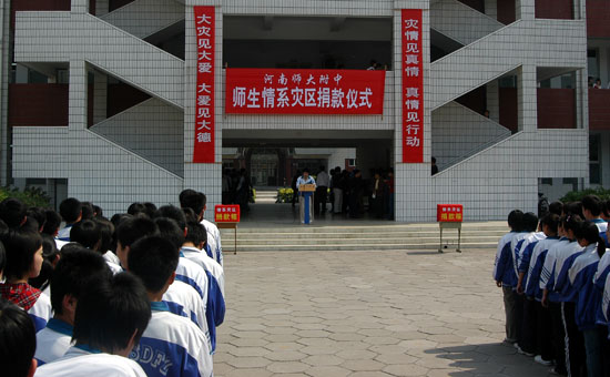 一方有难,八方支援;大地无情,人间有爱。近日来,发生在四川汶川县的特大地震灾害紧紧牵动着我校的7000多名师生员工的心。广大师生情系灾区,急灾区人民之所急,纷纷慷慨解囊,向灾区捐献爱心款项。5月14日中午,我校师生在两座教学楼之间的国旗广场举行了隆重的捐款仪式。该仪式是在校党总支的总体动员和部署下,由校工会、学生处等部门共同组织的,新乡电视台等有关媒体对这一热烈场面做了跟踪报道。截至14日下午放学为止,校工会共收到善款10万多元,计划于近日内尽快寄往四川灾区。
