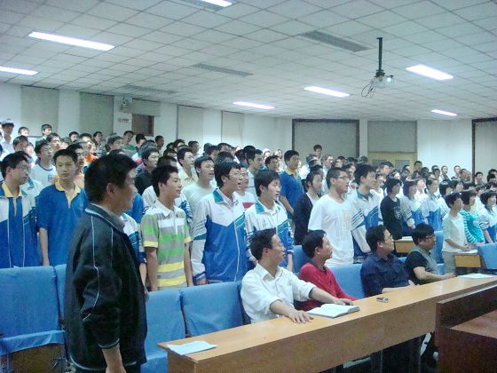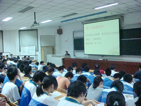 于老师首先以我校已经考取清华、北大的毕业生王衍、吴景然、刘博晓为例子,勉励学生树立远大的理想和追求,努力提高自身素质,加强文化修养,延续历史,再创辉煌。接着,于老师围绕十个特别——“特别的听话、特别的勤快、特别会提问、特别善思考、特别愿交流、特别会安排、特别有信心、特别有毅力、特别有追求、特别有朝气”,进行了层层分析和全面讲解。他生动幽默的语言,富有哲理的感悟,全面详细的讲解,独特的人格魅力,深深地触动了学生的心灵。最后,于老师和全体学生一起高喊着“十个特别”。学生一声声响彻会场的呐喊,把整个报告会推向了高潮。