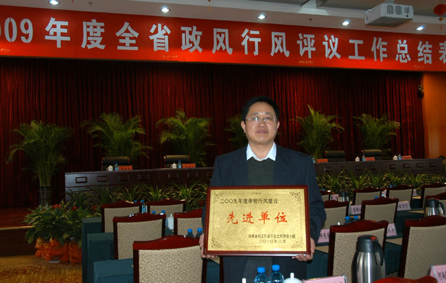 我校继2008年度被评为河南省行风建设先进单位之后,2009年再度被省纠风领导小组评为行风建设先进单位。刘黎校长代表我校出席了表彰会,并领取了奖牌。