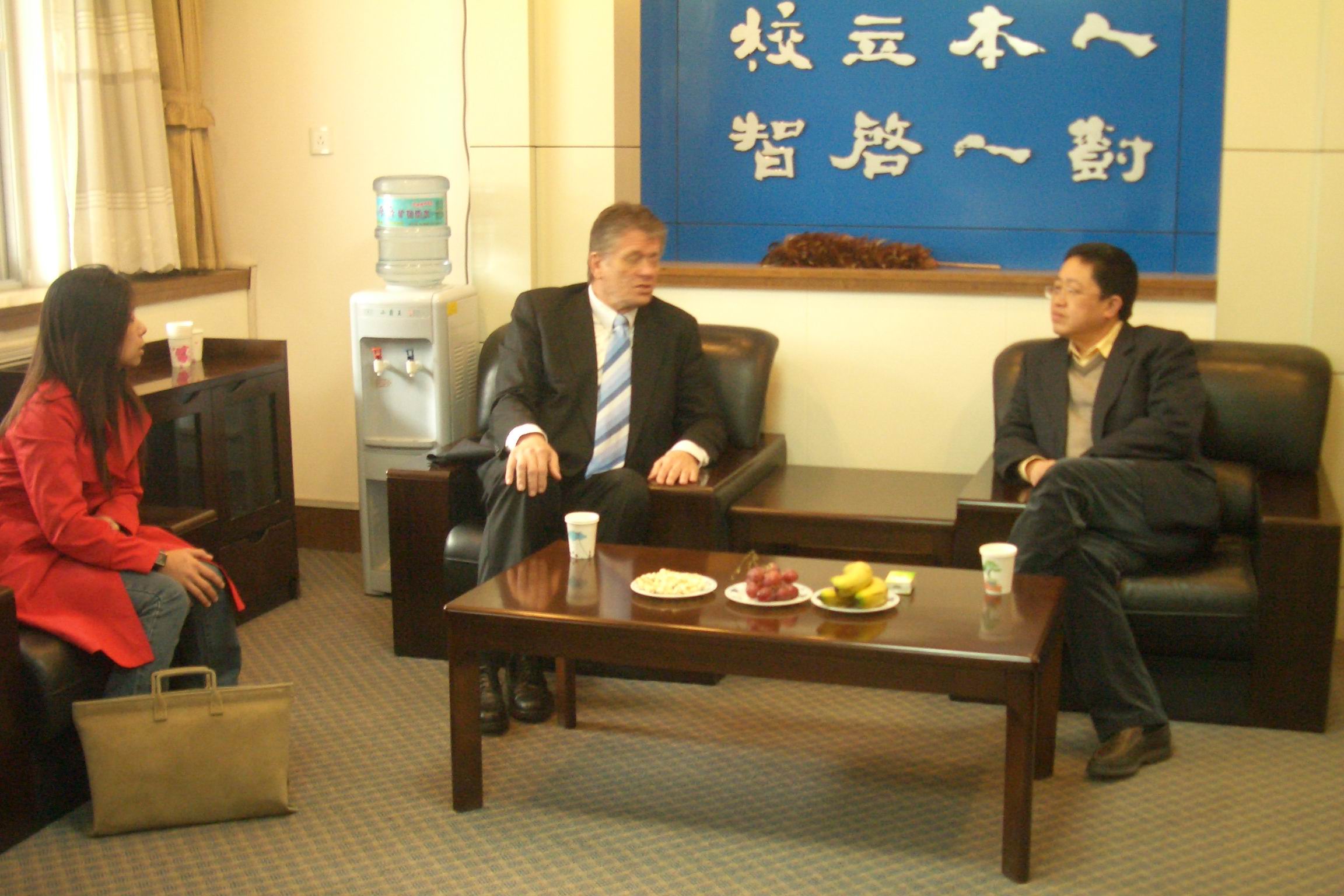 3月21日上午国际体验组织(international experience)总裁Paul和中国区首席代表甘莉玲一行莅临我校,Paul先生与刘黎校长和闫新全副校长就交换生项目(student exchange)进行亲切交谈,总裁Paul还与高一年级部分家长见面,详细介绍国际交换生交换生项目。