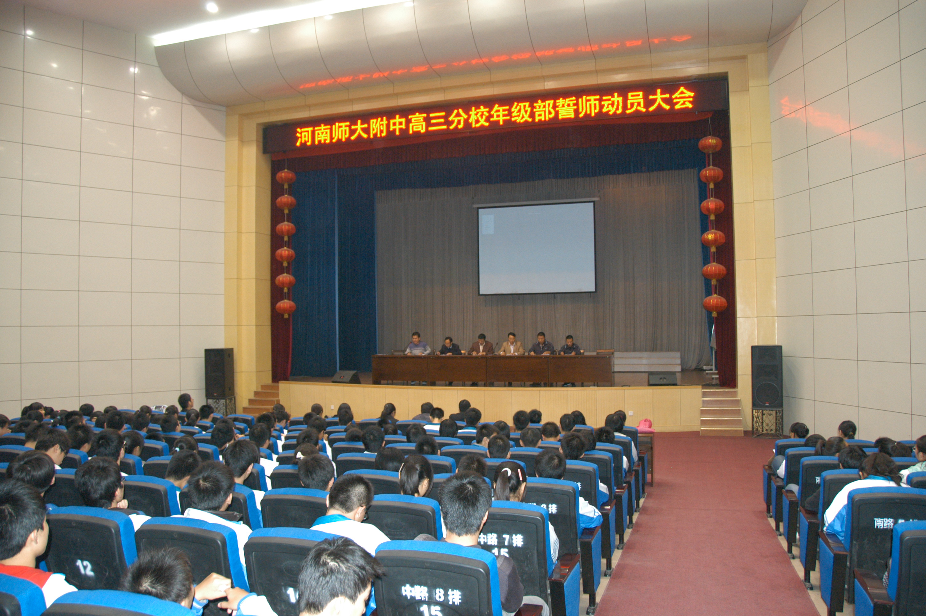 10月18日下午,我校高三年级分校在大礼堂举行高三宣誓暨第一次摸底考试动员大会。闫新全副校长、教务处赵振华主任、学生处刘新选副主任出席大会,大会由高三分校年级部副主任段来政老师主持,高三分校全体师生参加大会。