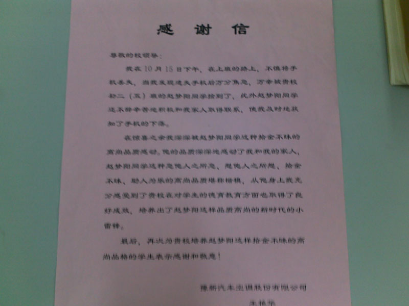 近日,我校初二年级分别收到一封感谢信和一面锦旗,这是初二年级金龙分校5班和本部5班赵梦阳和侯源泽两位同学拾金不昧的精神深深地感动了失主。