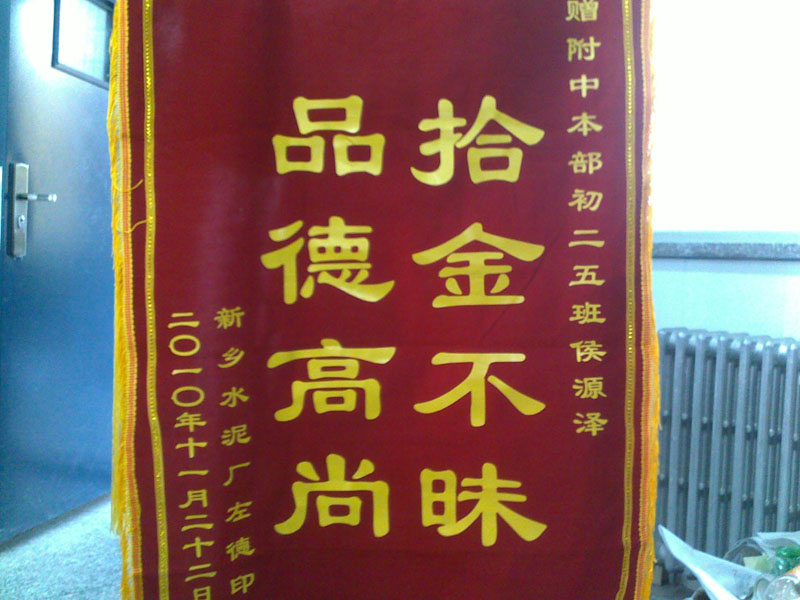 金龙分校5班赵梦阳同学在上学路上拾到贵重手机一部,他不辞辛苦及时与失主家人联系,让失主知道丢失手机下落。本部5班侯源泽同学精神更是可嘉,他拾到钱包一个,里面有大量现金和失主的身份证、银行卡、驾驶证等贵重物品,面对金钱的诱惑,意志坚定,与家人商量,及时通过钱包里失主的信息与及取得联系,让失主十分感动与感激,失主坚持要给侯源泽同学物质上的感谢,都被他好心拒绝,失主得知他是附中学生,特意制作了一面锦旗送到学校表现感谢。