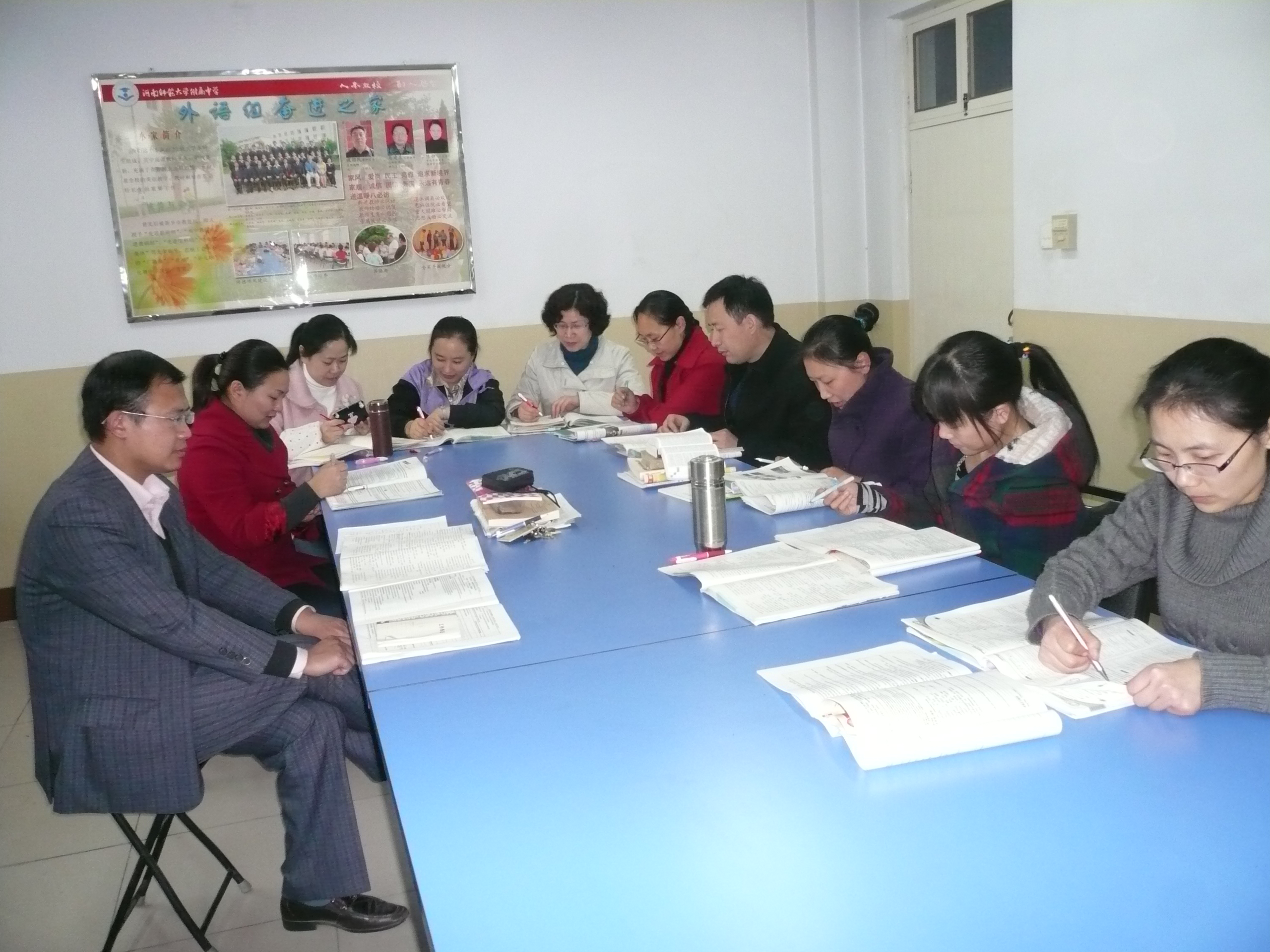 2010年11月25日下午第三、第四节课在办公楼四楼第四会议室,高二年级全体英语教师在备课组长杨楠老师的带领下例行开展了本学科的集体备课活动—期中考试总结及选修六第三单元的说课。