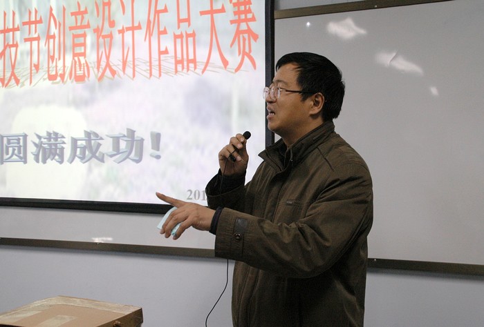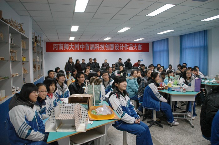 2010年12月30日下午4点,实验楼科技创意实验教室外,寒风刺骨,而室内却暖意融融,高一各班创意设计队员济济一堂,采用现场方式进行科技成果展示。河南师大附中副校长闫新全,高中教学部主任赵振华,团委书记杨呈杰莅临现场指导。高一年级部主任李杰明和全体班主任进行现场观摩,通用技术王国军、张红博老师全程负责科技成果展示的各项工作。