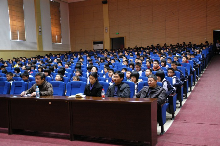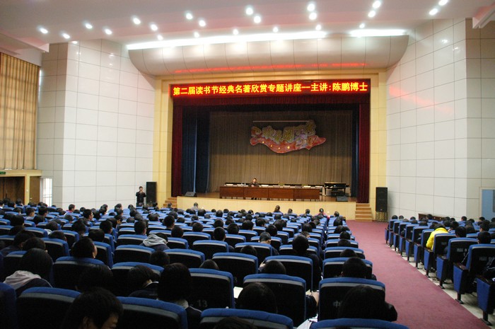2011年3月16日下午,西校区教工礼堂座无虚席,掌声不断,为迎接我校第二届读书节,校团委和初一年级部邀请河南师范大学文学院陈鹏博士来我校为初一年级学生举行经典名著欣赏专题讲座。报告会由初一年级部主任宋玉亮老师主持,初中部刘峰副主任、初一年级部副主任薛卫忠、郭学明和语文备课组全体老师参加了此次会议。