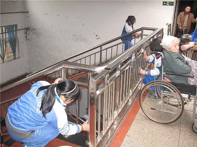 走入老年中心的大门,同学们顾不上旅途的辛苦和扑鼻的异味,立刻投入热情洋溢的劳动中。在工作人员的协调下,国际部的同学分成四个小组,负责各自的服务项目。有的负责擦楼梯扶手,有的负责擦门窗,有的负责扫地,有的负责拖地,每个人都兴致勃勃,认认真真地劳动着。让人感到欣喜的是,这些原本在家养尊处优的孩子们,在这一刻完全变了一个样,用他们自己的话讲,“我好像看到了自己的爷爷、奶奶和很多年后老去的父母”。