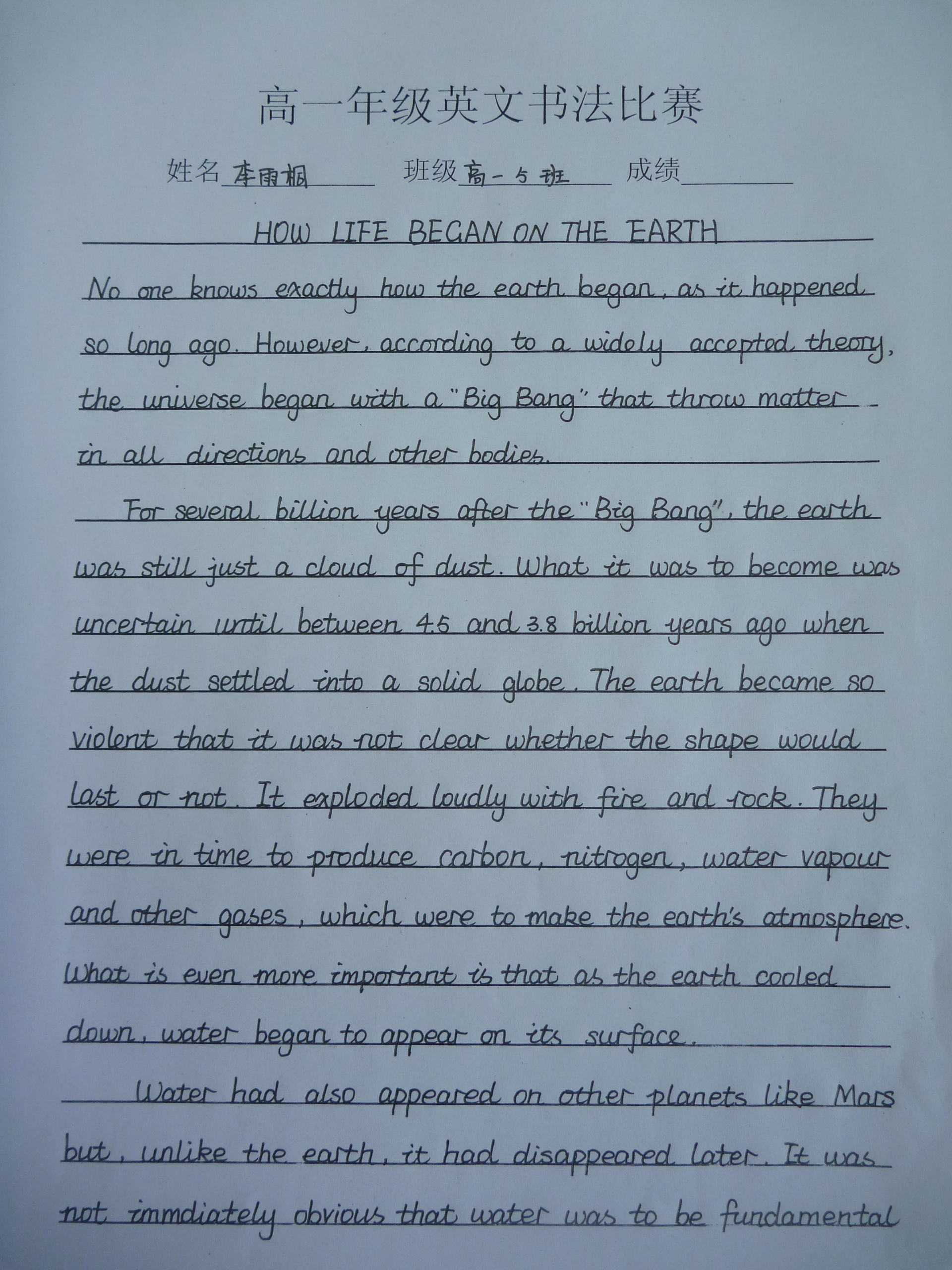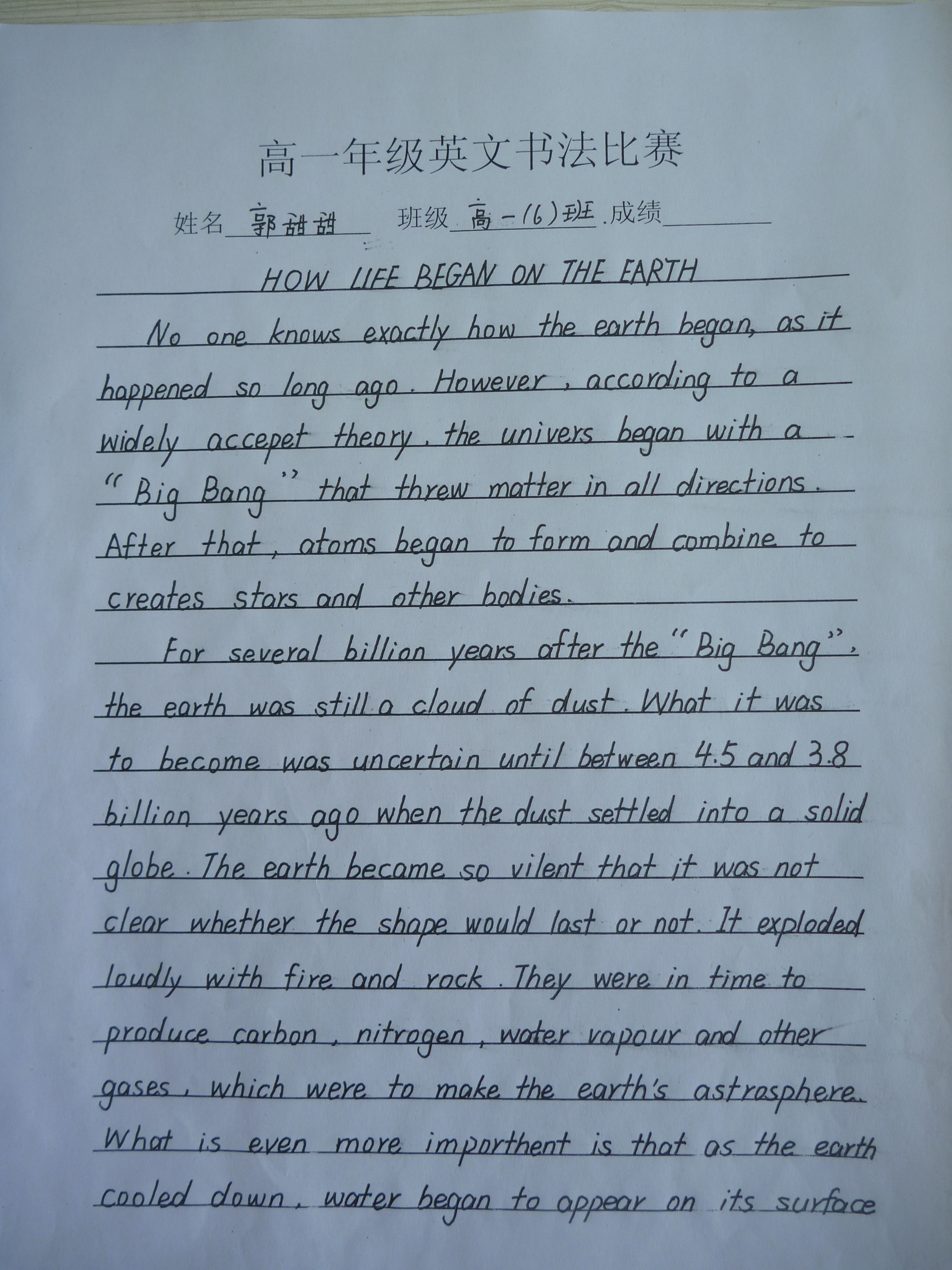 为提高学生英语学习兴趣,培养学生规范书写英语的意识,练好学科基本功,高一年级外语组举行了英语书法比赛。在陈龙、何华星和赵培杰老师的具体策划和实施下,各班预赛选拔的10名同学,于3月31日在我校科技馆参加了英语书法比赛。