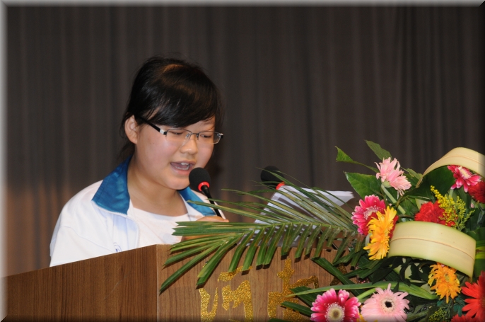 大会第一项是奏国歌。当雄壮的国歌在礼堂里响起,此时此刻,全体肃立的同学分明更深刻感受到了沉甸甸的责任和使命。接下来,滑秀林书记宣读了《关于准予初中部2011届学生毕业的决定》。随后都温中老师和刘萍萍女士代表教师和家长先后发言,接着,伴随着歌曲《感恩的心》,学生代表向教师代表和家长代表献花,表达了深深地敬意和感谢。在学生代表张玮珂同学发言后,伴着《毕业歌》,各班班长走上主席台,从校领导手中接过了本班薄薄的却又无比厚重的初中毕业证书。