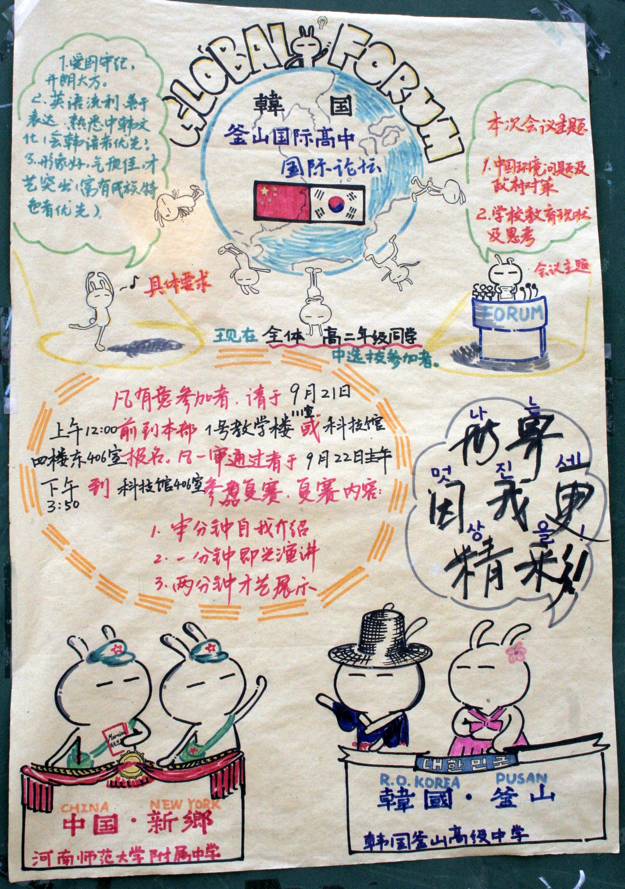 “2011年韩国釜山国际高中国际论坛(The BIHS Global Forum)”将在11月初举行,有来自瑞典、日本、新加坡、中国和韩国五个国家选派的高中生参加。本届论坛以“Environmental Issues and Global Cooperation”为主题,学生要就大会主题做20分钟的主题发言并对别国发言做评论,会后还要进行才艺展示。届时,我校领导也会就“中国文化”向来自世界各国的师生做主题报告。