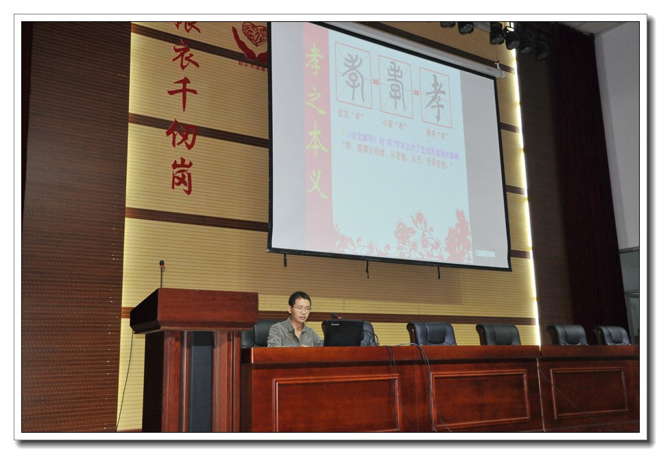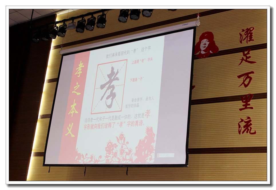 本次活动由“省己身”开始,全体与会人员围绕主持人所提出的“作为子女,父母的生日你能熟记于心吗?”等三个问题进行反躬自省。感恩的心,感谢有你,唱响《感恩的心》,以感恩的情怀去孝敬父母,以感恩的行动去回报社会。在学模范环节,大家首先观看了恪守孝道的平凡女孩——孟佩杰的模范事迹,在孟佩杰的年轻生命力,虽然艰辛填满四千多个日子,可她的笑容依然灿烂如花,她以感恩之心,用微笑来回报这个世界,用孝心来绽放生命的绚烂。她的孝心感染了在场的每一人。接下来,主讲人王阳老师以其渊博的学识围绕“孝之本义,为何要孝,孝之典范,如何行孝”,为我们诠释了“孝”的经典,激发了学生内心对父母及时尽孝的情怀。在“诵经典”环节,所有同学以感恩的心,诵响了自己内心深处对父母及时尽孝的宏愿。当传统的孝的经典响彻在整个会场时,同学们洗涤的不仅仅是心灵,践行的更是对父母发自内心的感恩。在本次活动即将落幕之时,所有参会人员还彼此交流了自己的心得体会。活动结束后,与会领导、老师、学生纷纷将写有自己心灵感悟和真诚祝愿的卡片贴在礼堂门口的心愿墙上。