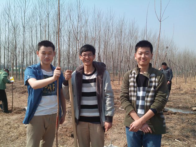欢迎仪式一结束,金龙村的绿化员给大家演示了种树的基本步骤和关键技巧,然后师生一起3人一组便开始了植树行动,三人各有分工,一人扶树,一人填土,一人提水,齐心协力,兴高采烈地把一棵棵小树种下。经过一个多小时的辛勤劳动,大家都汗流浃背、满身是土,但看着自己亲手种下的一排排小树,每个人脸上无不洋溢着幸福愉悦的笑容,劳动的成就感油然而生。