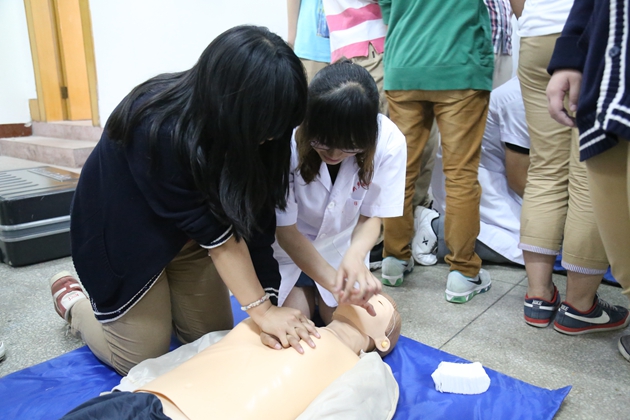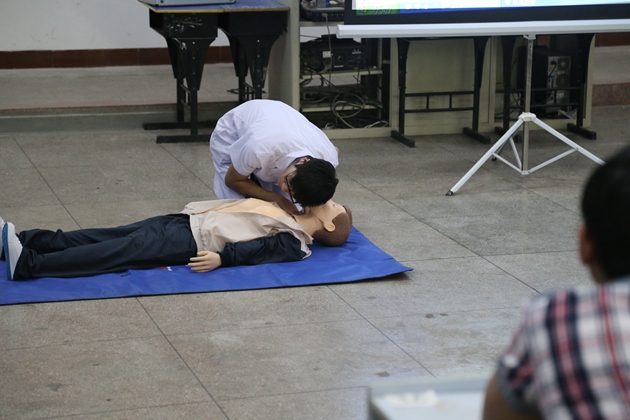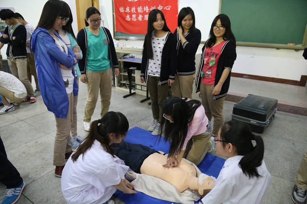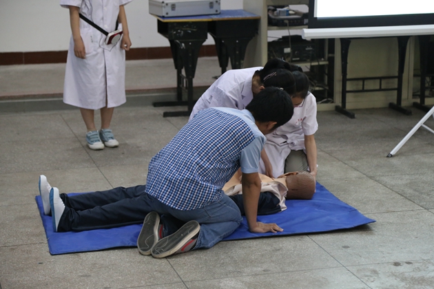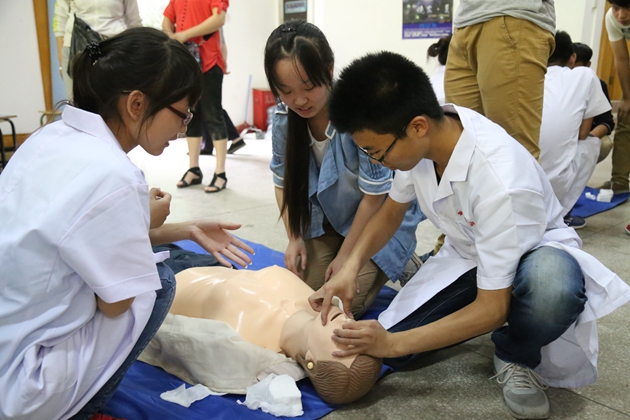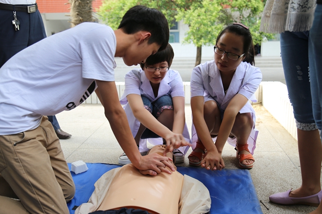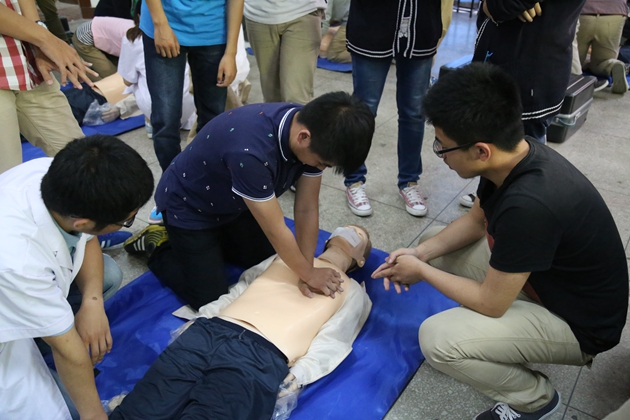 在详细的讲解之后,陈教授还让志愿者对师生进行了情景模拟急救实景培训。