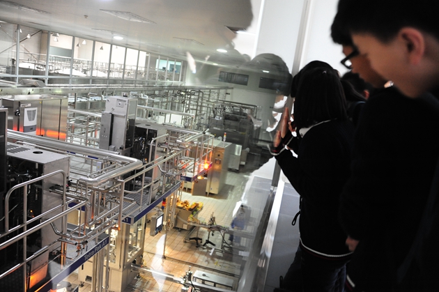 讲座结束,全体师生又赴北京三元乳业新乡分公司参观学习,该公司是集生产、研发及配送一体的综合化的产业基地,主要生产常温奶、低温巴氏奶、低温酸奶及瓶装产品等。洗瓶、灌装、装箱、码垛等一系列流水线机器都能完成,机器人手臂装捡货物。工人只需通过中控系统监控就能操作。三元生产包装过程已经完全实现了全自动化,减少了人为干预,也就减少了食品安全的风险和隐患。通过参观,师生都惊叹于现代化生产技术的巨大能力,也加深了对“科学技术是第一生产力”的认识。