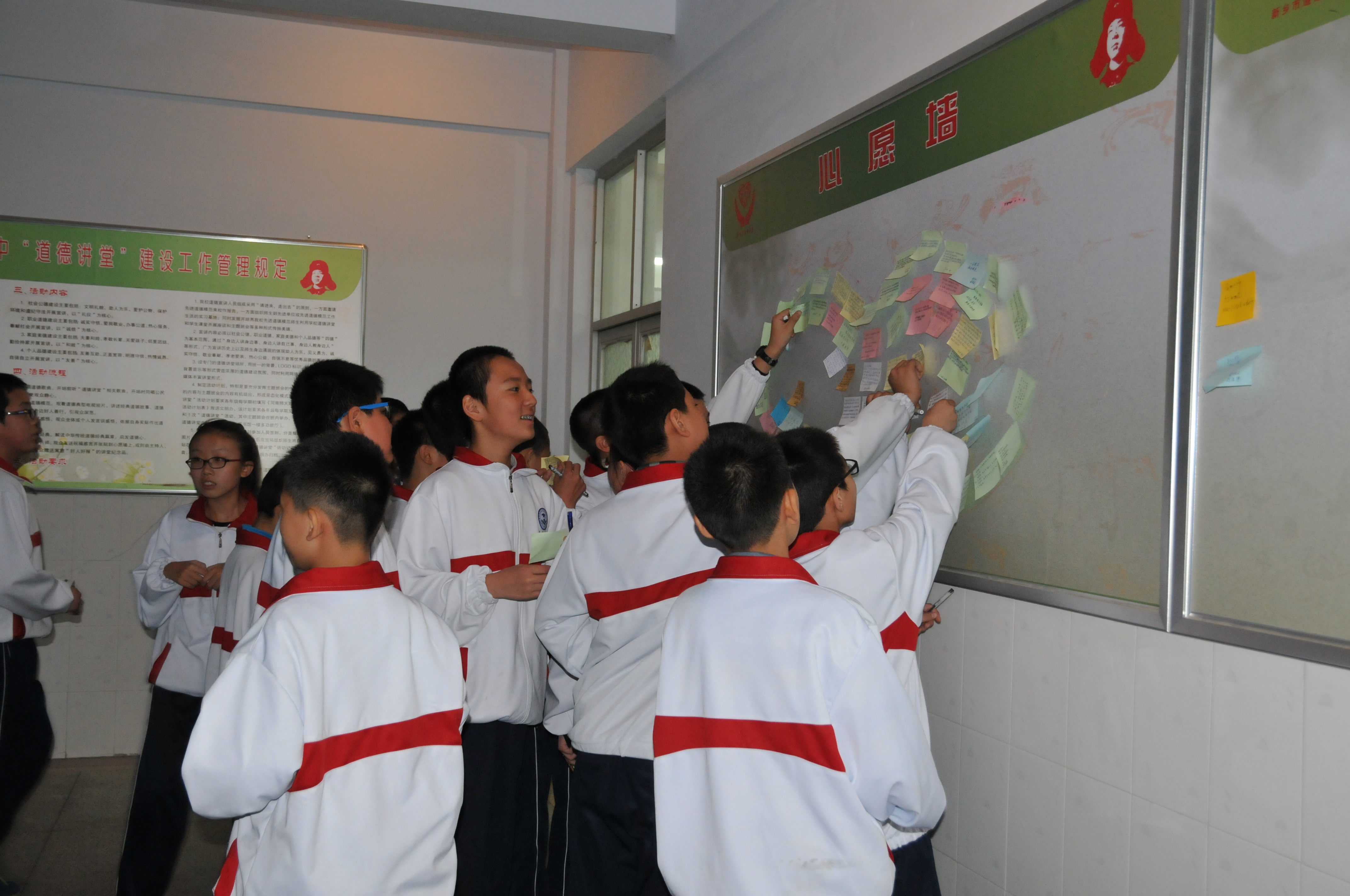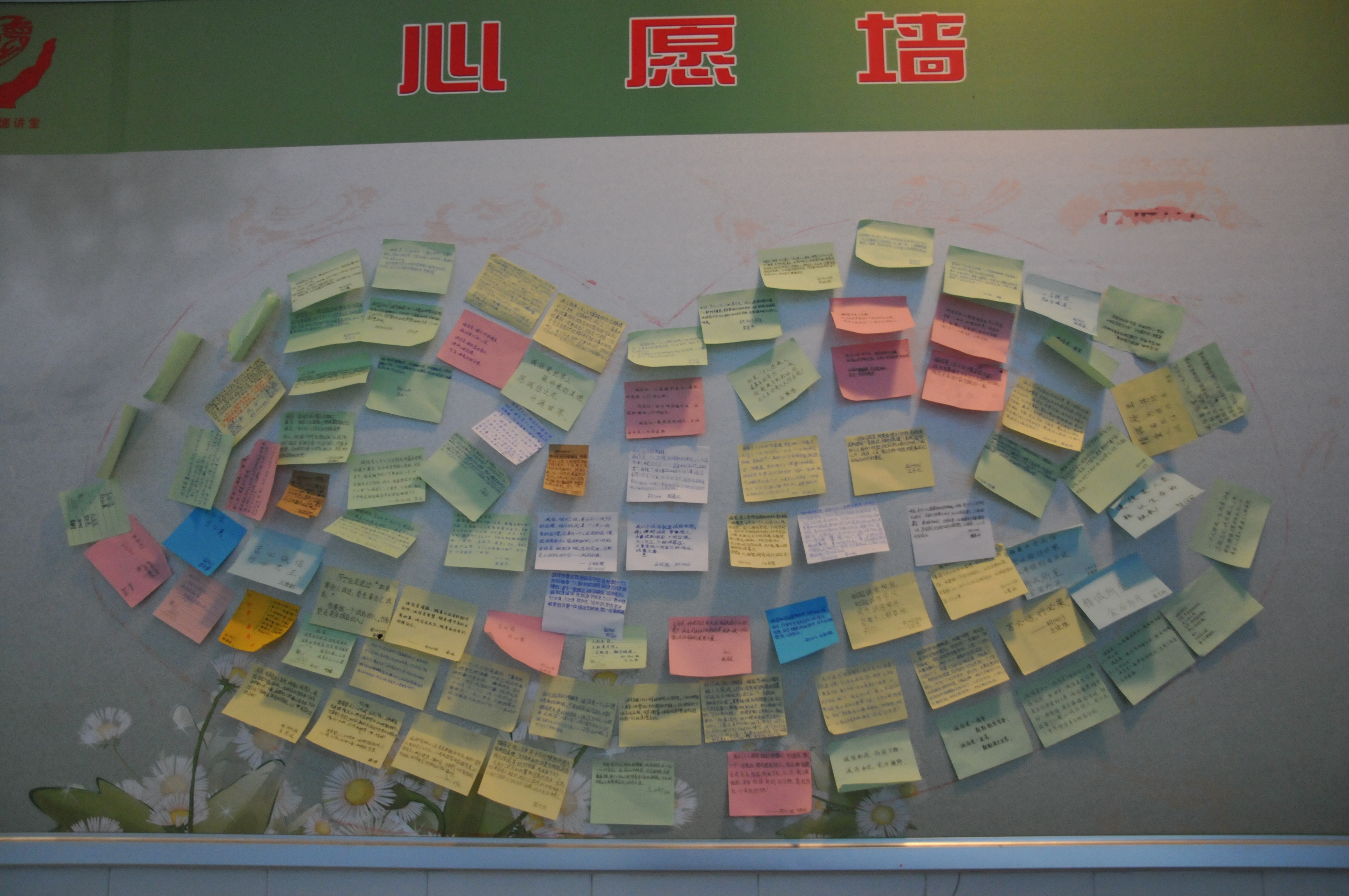 春秋大义,大道明德,师生共诵诚信经典,共写诚信贴,共贴心愿墙。道德讲堂以“身边人讲述身边事,身边事教育身边人”的方式,使广大师生受到了一次诚实守信的道德洗礼,与道德牵手,与和谐同行,以德化人,彰显我校文明新风。