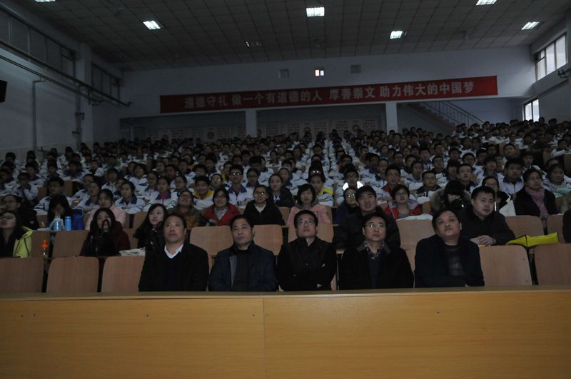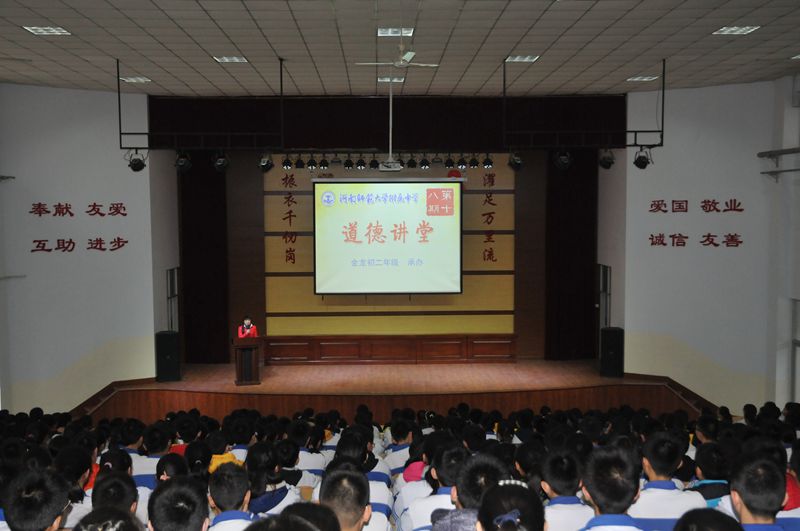 2015年1月12日下午,河南师大附中第十八期道德讲堂开讲。本期道德讲堂由金龙初二年级承办,主题为“用实际行动传递社会正能量——我为社会主义核心价值观代言”。学校党政领导及金龙初二年级500余名师生共同参与了本次活动。