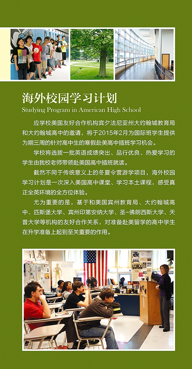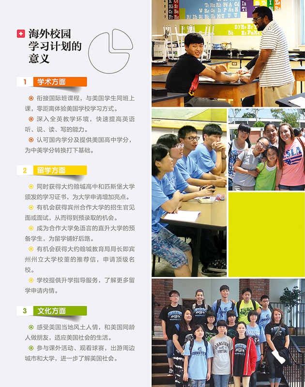 尤为重要的是,基于和美国宾州教育局、大约翰城高中、匹斯堡大学、宾州印第安纳大学、圣-佛朗西斯大学、天普大学等机构的友好合作关系,对准备赴美留学的高中学生在升学准备上起到至关重要的作用。