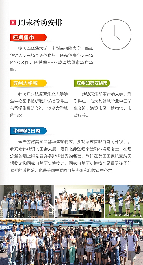 - 美国文化的探索体验活动:观看匹兹堡橄榄球比赛(自费)、参观当地的工厂或公司、观看高中校际各种体育比赛。
