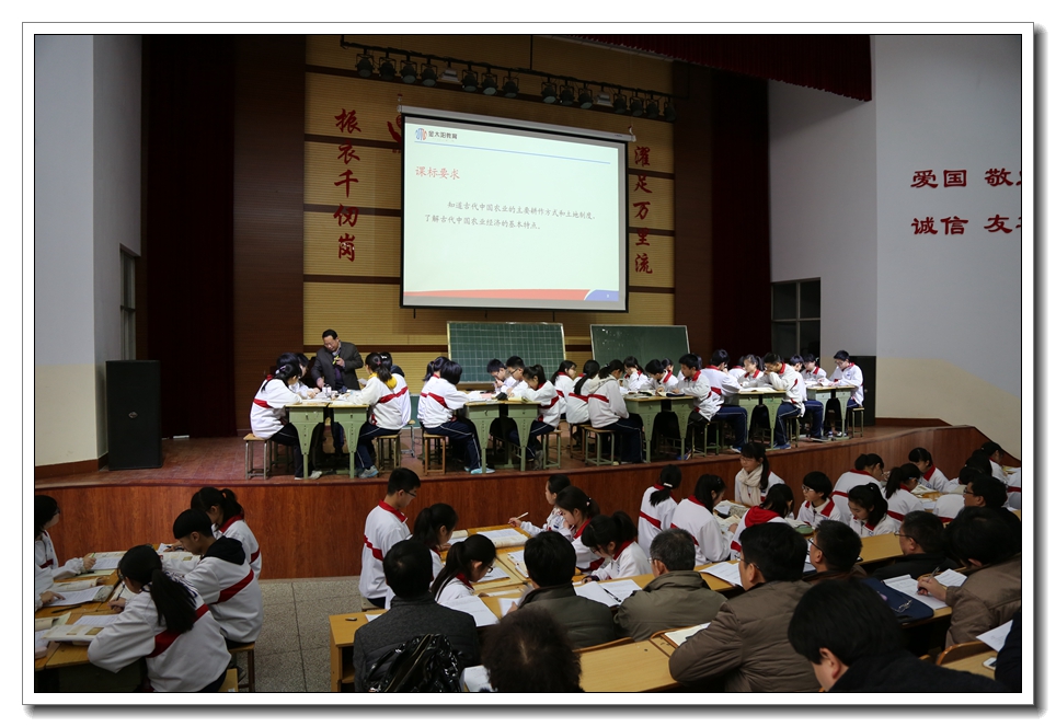 惊蛰已过,春分在望,伴随着大自然悄悄露芽吐蕊、万物竞发,导学自主课堂教学改革的春风也吹遍了校园。 2月26日,正月初八,上午8:00,校导学自主课堂教学改革攻关小组全体成员齐聚办公楼四楼阶梯教室,明确要求、领受任务、协作攻关、开始了“学科三年一体化规划方案”、“导学案”和“作业自助餐”的编制。五天的脑力辛劳,集体智慧的结晶,为未消散的年味添了些许别样的味道…… 3月3日,正月十三,下午2:30,各学科导学自主课堂教学改革攻关小组组长依次登台,展示本学科“导学案”和“作业自助餐”编写成果,各领风骚。 3月4日,正月十四,下午3:00,各教研组进行全组培训,讲解学科规划、导学案和作业自助餐编写方案,统一要求、分解任务,各年级备课组迅速行动起来。 3月8日,星期日,江西金太阳教育研究院的专家对全体教师进行了培训。上午,柏成刚院长做了题为《让幸福环绕》专题报告,从营造校园的幸福文化、营造幸福的管理机制、让学生成为幸福的源泉和如何把握自己的幸福四个方面阐述了如何成为一名幸福的教育工作者。下午,陈斌校长以“为有源头活水来”为题,为老师们解读了新课改背景下高效课堂的构建,重点就学习小组建设进行了细致指导。陈校长把学习小组的构建管理总结为“分组有原则,团队有组织,小组有文化,座位有模式,人人有职责,事事有评价”,为班主任指明了方向。全体级班主任“调座位”、“分小组”,迅速行动起来。 3月9日,开学第一天,下午第三节课,全体教师分文理观摩学习了金天阳教育研究院专家的示范课,对导学自主教学改革学科自习和课堂教学的流程及操作要点有了直接的感性认识。各年级各班大胆的实践全面展开。 3月10日,19:00—22:35,校级领导逐一审看各年级各班学习小组组名和口号,研讨导学自主课堂教学改革下一步的推进工作。 3月11日,17:45—18:50,下午放学后,全校级班主任会议在办公楼四层阶梯教室召开,导学自主课堂教学改革督导委员会各督导小组组长依次汇报了巡视情况,指出了存在的问题和努力的方向。会议结束后,有晚自习辅导的班主任来不及吃饭,直奔教室…… 3月13日,15:30—17:35,历时155分钟的校行政会有135分钟的时间围绕“如何积极、稳步、科学、有效地推进导学自主课堂教学改革”这个主题,督导小组汇报,分享各年级经验,布置下周听课督导工作,校领导依次讲话指导,再次统一思想、提高认识。 走出办公室,已然华灯初上、暮色低垂。漫步在宁静的校园,微风拂过,暖暖的——哦,春天来了,教改的春天……