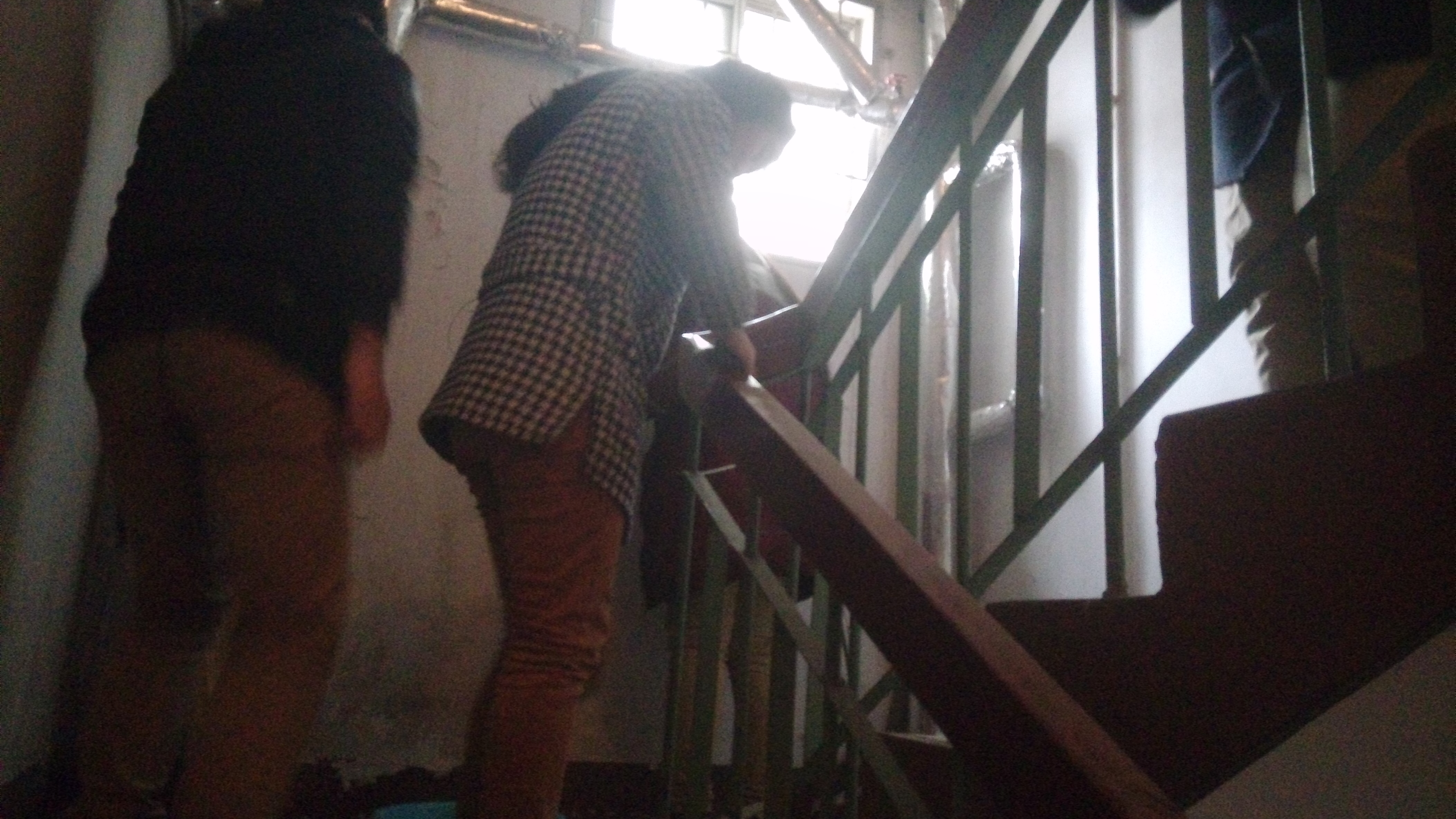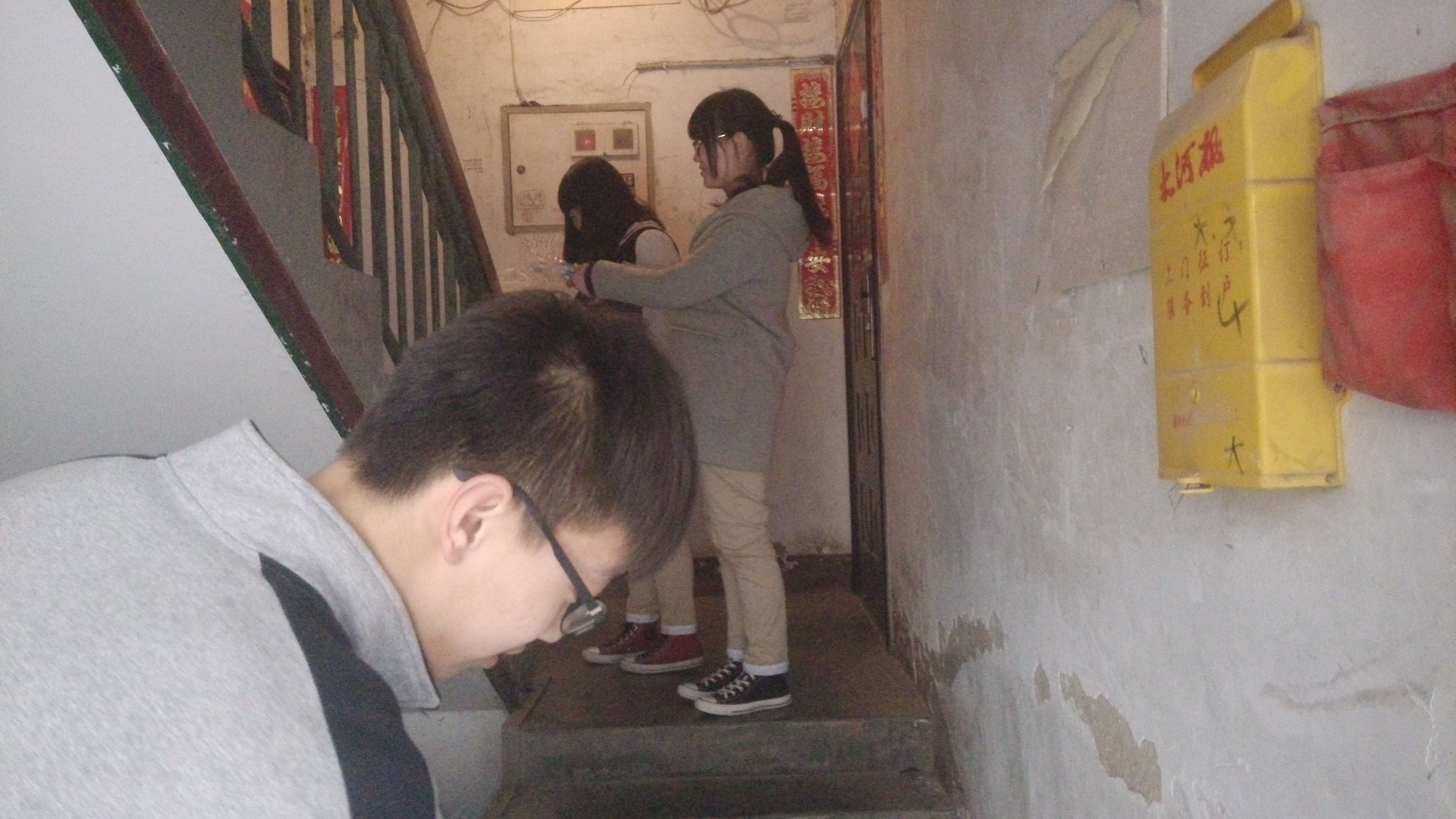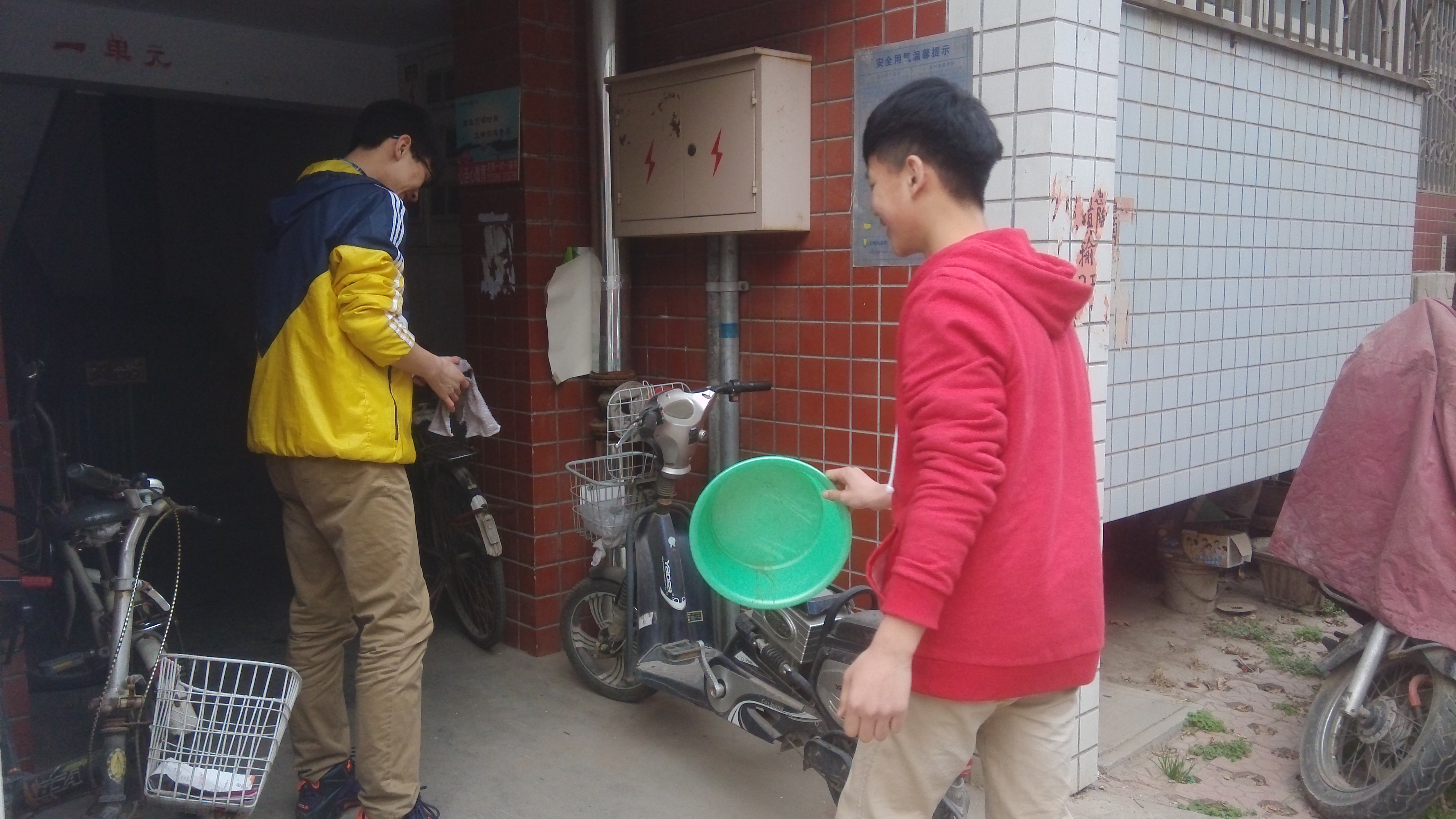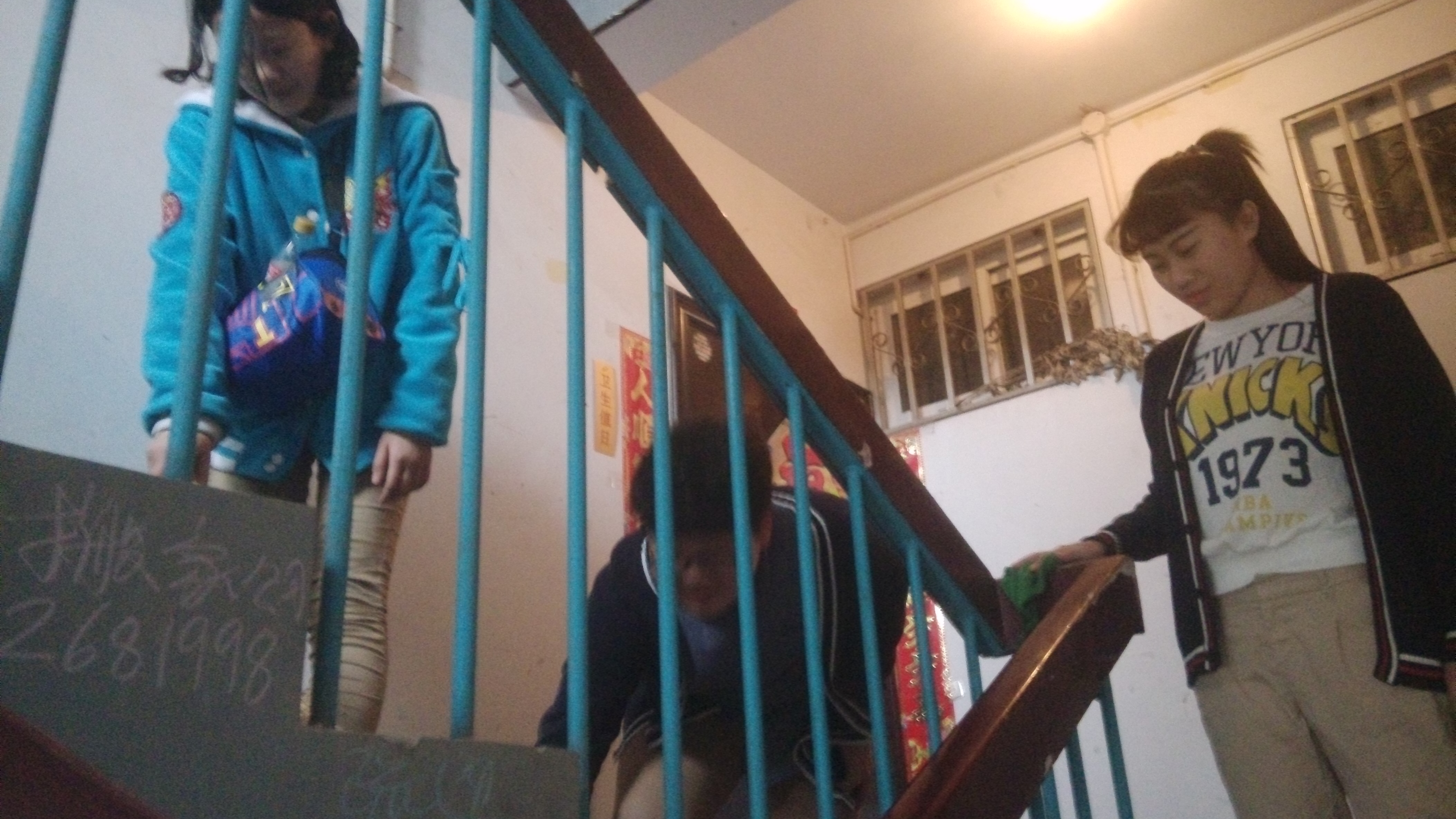 23日下午的班会课时间,高一中韩学子带着从家里带来的笤帚、水盆、抹布等劳动工具,排着队伍,走出校门,来到学校东家属院,走进一幢幢家属楼,对楼道卫生进行了清扫。
