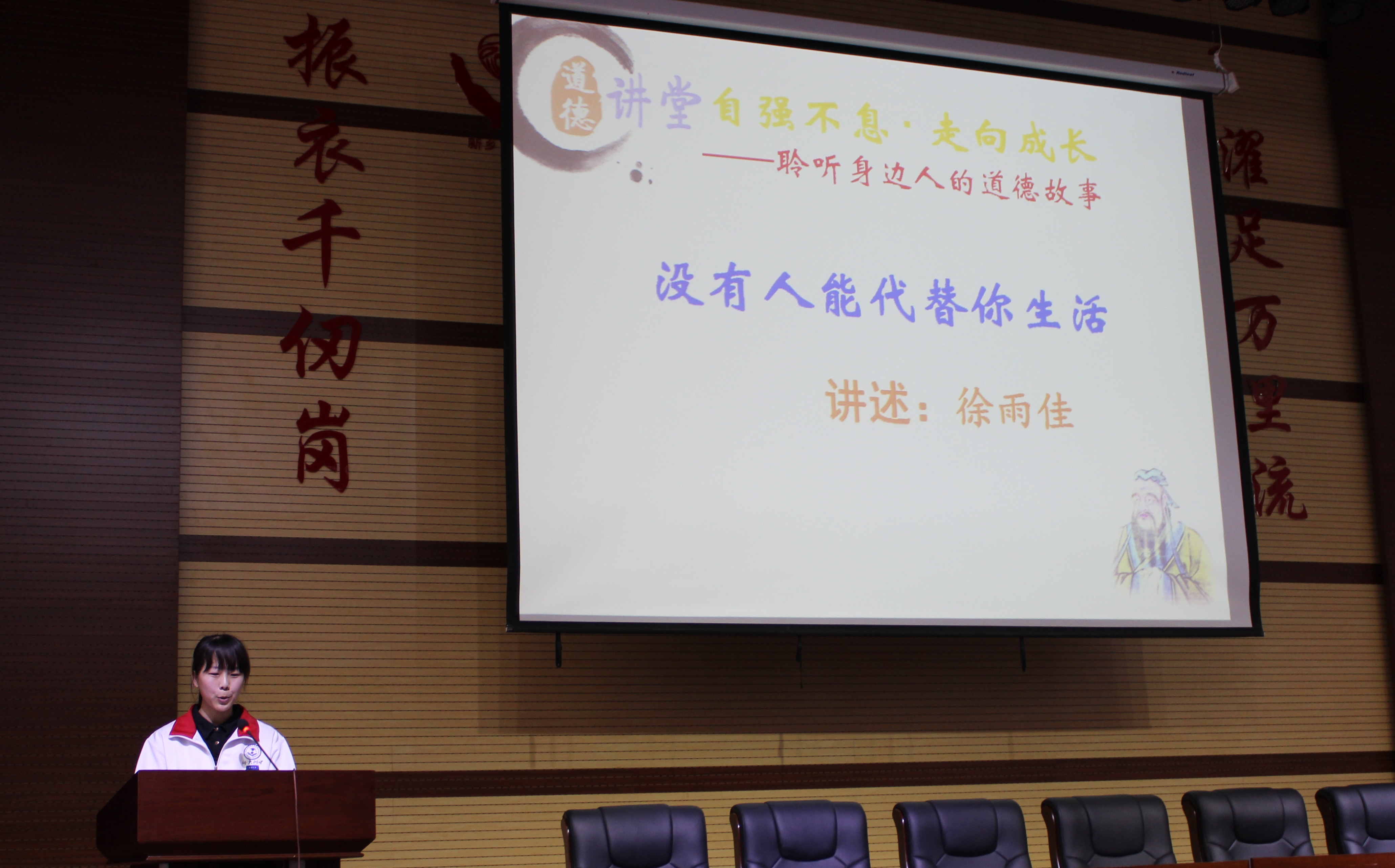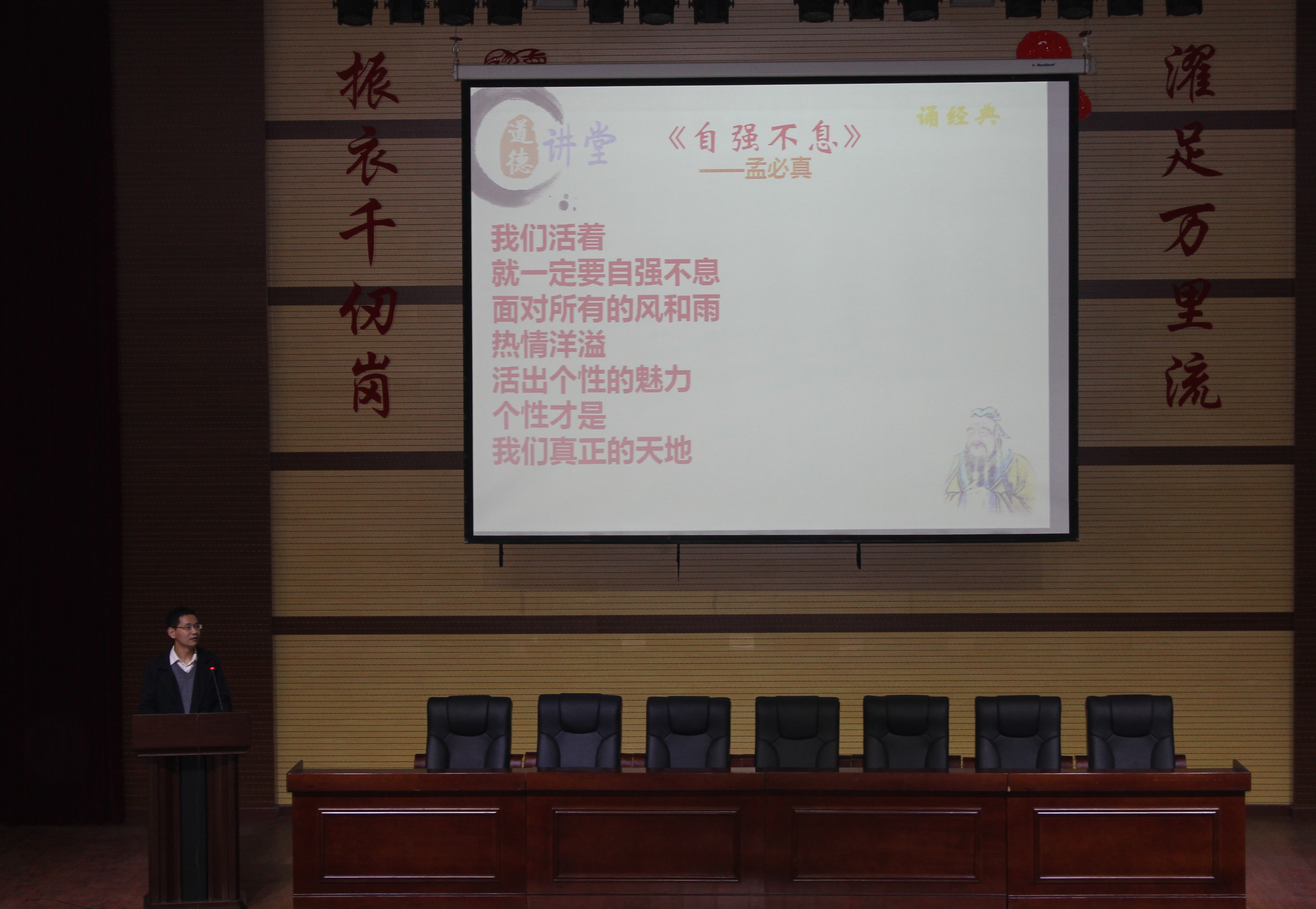 娓讲述了她的一段不寻常的人生故事和人生感悟。“我的生命不是用来荒废的,我的青春不是用来泡在手机电脑电视里的,我只活一次,趁我还有能力,我什么都想去试一试,所以没有什么敢不敢。”“我深深地知道,没有人能代替我生活,我的路只能由我自己一点一点铺设。没有什么可依靠,只有我自己。”师生们细细聆听,潸然泪下,为之感动,心生敬意。接下来,高一本部全体学生齐声高诵现代诗人孟必真的诗歌《自强不息》。“我们的岁月 骄傲的就是自强不息 面对命运的缭乱凄迷 奋斗不止 才会找到花期 青春不会老 只要爱常住心底”等诗句让人心潮涌动,澎湃不止。 又共同聆听了高一10班张一帆和高一2班岳嘉欣同学对自强不息的感悟。然后,高一语文组张军老师畅谈自己对自强不息精神的理解,让人深受鼓舞。