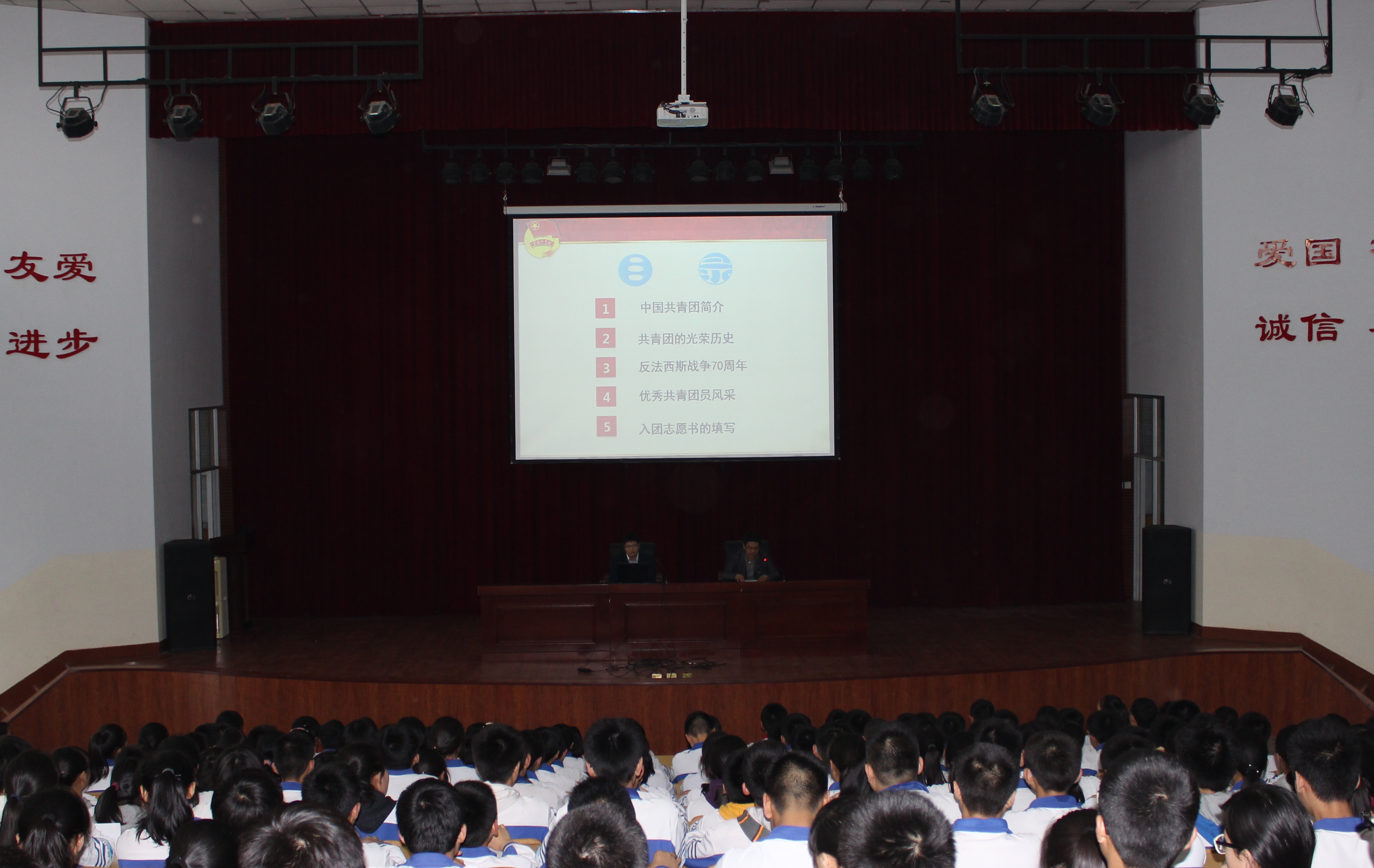 开课前,我校团委书记杨呈杰老师代表校团委发言,他讲到今年是世界反法西斯战争胜利70周年,也是中国人民抗日战争胜利70周年,国家的和平发展和我们的幸福生活来之不易,希望同学们要铭记历史、勿忘国耻,并要求新团员们要通过学习《团章》和相关理论知识,了解中国共青团的发展历史,了解中国共青团作为中国共产党的助手和后备军,所应具备的思想觉悟和责任义务。