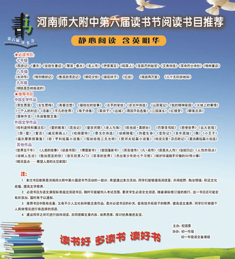 按照学校《关于举办第六届读书节活动的通知》要求,本着“三年一体化”原则,依据教育部《义务教育语文课程标准》(2011年版)和学生学习发展规律,金龙初一语文组教师特向全校初中生推荐100部名著,为初中生选择图书提供指导,培养学生阅读名著的爱好,努力提高学生鉴别书籍优劣的能力。