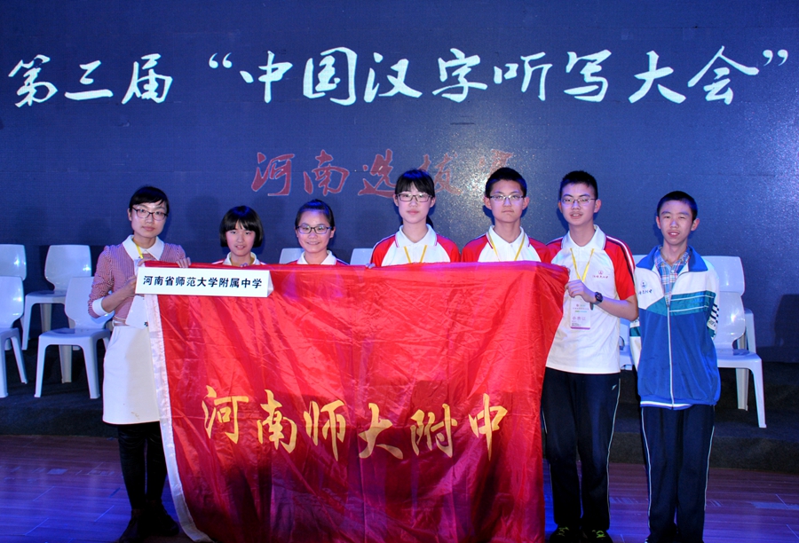 在小组赛中,我校与商丘市、三门峡市等5支代表队一同分在D组,按照“一人胜出,全组进决赛”的淘汰赛制规则,我校选手蒋明昊在场上只剩下三人的情况下,以一敌二,写出了“俳谐”一词,却遗憾在“渴尘万斛”一词上,最终我校团队在2015年第三届中国汉字听写大会河南赛区选拔赛中获得小组赛第二名的成绩。