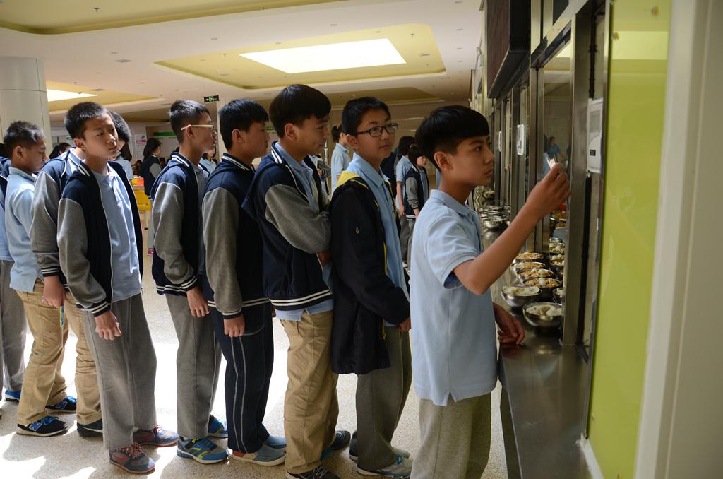 学生们有秩序的排队准备就餐