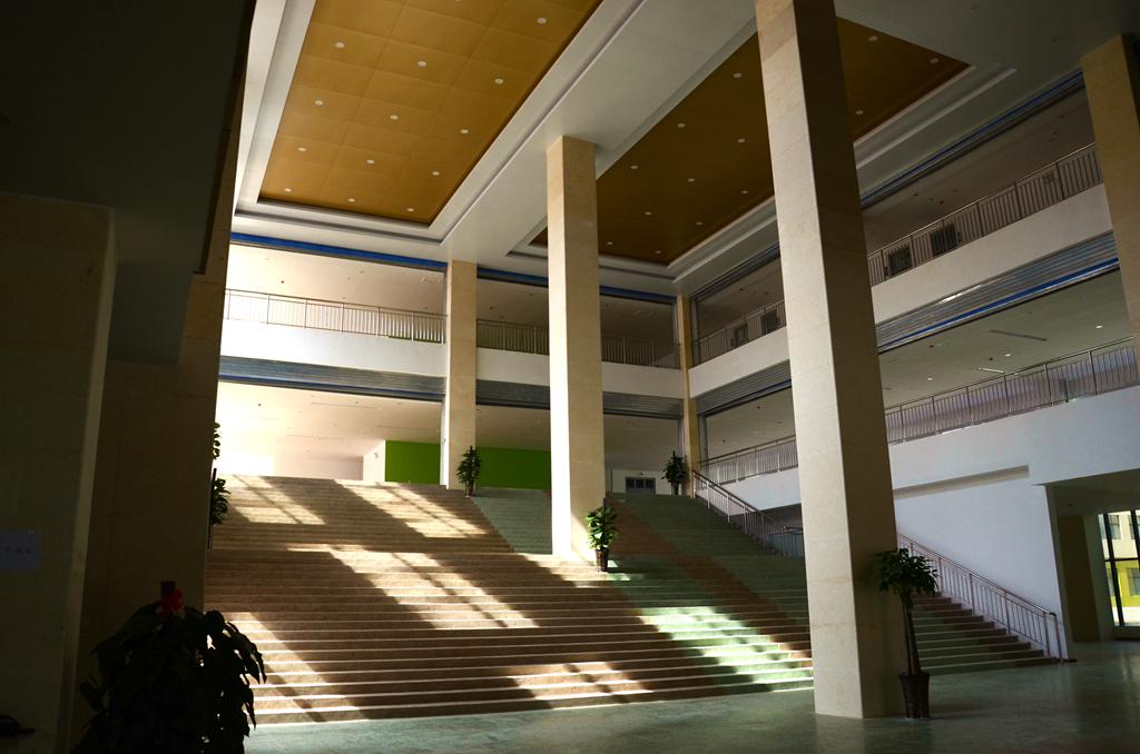 走进优美的校园,首先迎来的是威严高大的行政楼,行政教学楼里分有小学部,初中部以及高中部,为了考虑学生的安全,每个年级划分了明确的课间活动区域,并在走廊上设有课间阅读的课外读物,以及学生的作品展示。校园内有图书馆,录音棚以及多媒体演讲大厅。