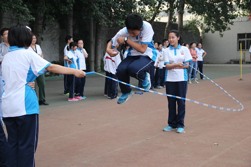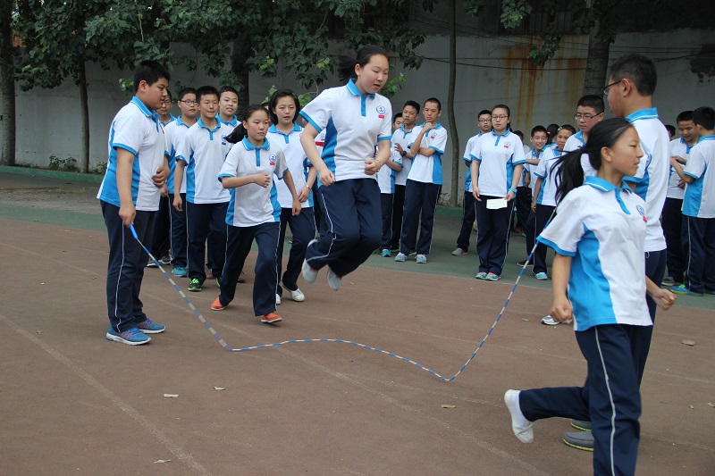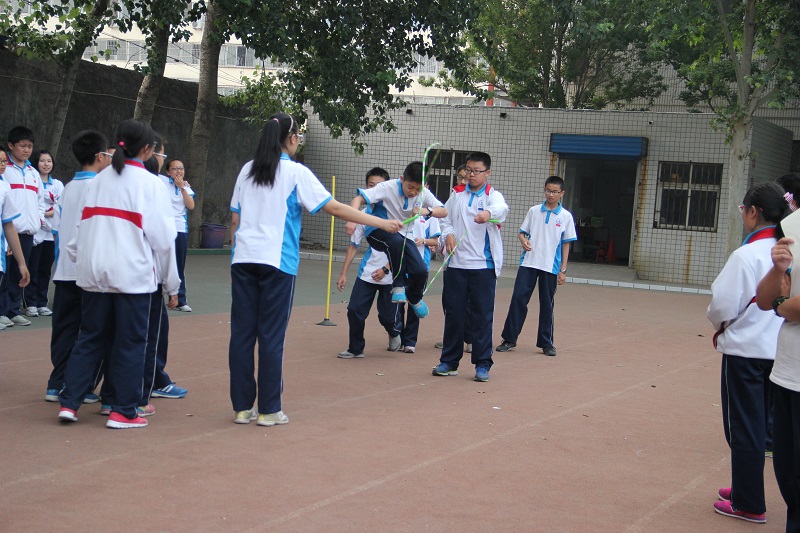 活动分两大项目,项目一是齐心协力跳大绳。参赛对象:每班12人,跳绳队员5男5女,摇绳2人(男女不限,不换人)。比赛规则:10名队员八字形绕绳跳,1分钟计数。经过激烈的比赛最终初1402、1406、1405班获得一等奖,1401、1403、1404班获得二等奖。