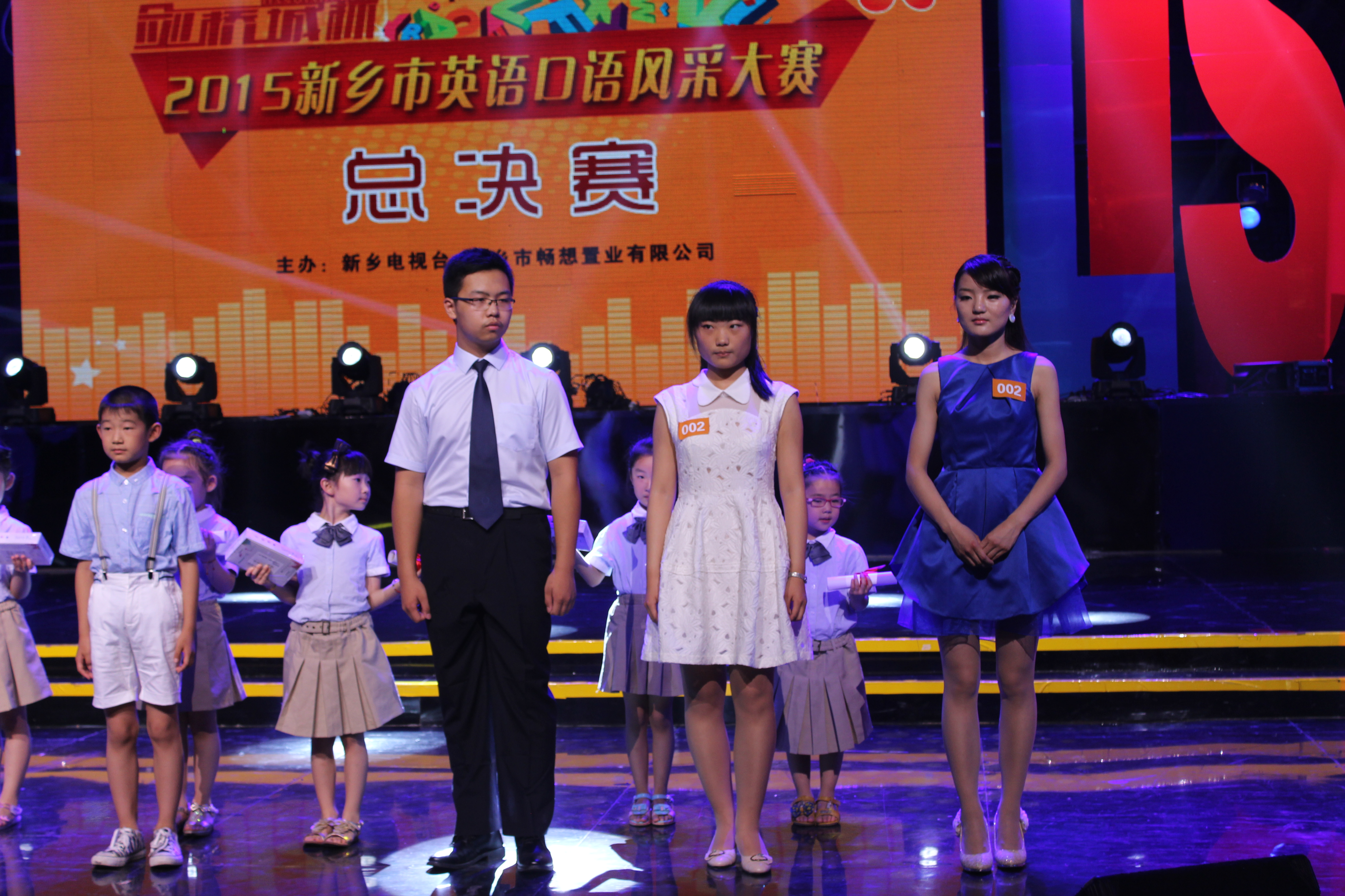 2015年新乡市首届英语口语风采大赛历时两个多月于近日圆满落下帷幕。本次比赛由新乡电视台主办,共分幼儿组、小学组、初中组、高中组及大学组五个组别,赛事得到了全市二十多所学校的大力支持以及4300多名选手的踊跃报名。经过海选、复赛、半决赛、决赛的层层选拔,我校初中学生张艺馨、宋佳蔚、郝瀚泽,高中学生周雨晨、唐朝脱颖而出,最终闯入总决赛。