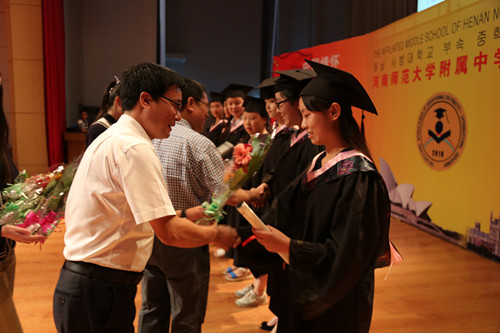 随后,赵振华副校长宣读了《关于准予2015届国际部学生毕业的决定》,郑重宣布国际部2015届66名毕业生完成欧美A-level及中韩项目全部课程、顺利毕业,并向学生们送上温暖的祝福。简短有力的毕业令宣读过后,毕业同学身着学士服,精神饱满地依次登台,刘黎校长、杨宝刚书记、赵振华副校长和国际部王晓玲主任向他们一一颁发了火红烫金的高中毕业证、红丝缠绕的A-level毕业证,还代表学校送上馥郁芬芳的花束。学生们手捧鲜花和证书,脸庞绽放着自信的微笑,和学校领导共同面对镜头,定格青春最美的一刻。之后,多位品学兼优的国际部学子走上礼堂舞台这一荣誉的殿堂,刘齐晋副校长、王继民副校长、项目合作方代表曹华先生、张秀丽女士向他们颁发了奖品,对他们在校期间取得知识与能力、道德与品质的全面提升表示祝贺。