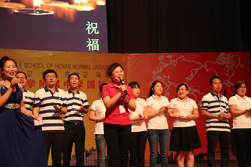 合唱结束时,王晓玲主任代表并带领国际部所有老师向学生送上祝辞,为国际部2015届毕业生的中学生涯画上了圆满的句号,毕业生们则再次走到台上,和领导、老师、同学拥抱作别、合影留念,任惜别的泪水流满脸庞,把学士帽高高抛起,让快乐飘荡在整个会场……