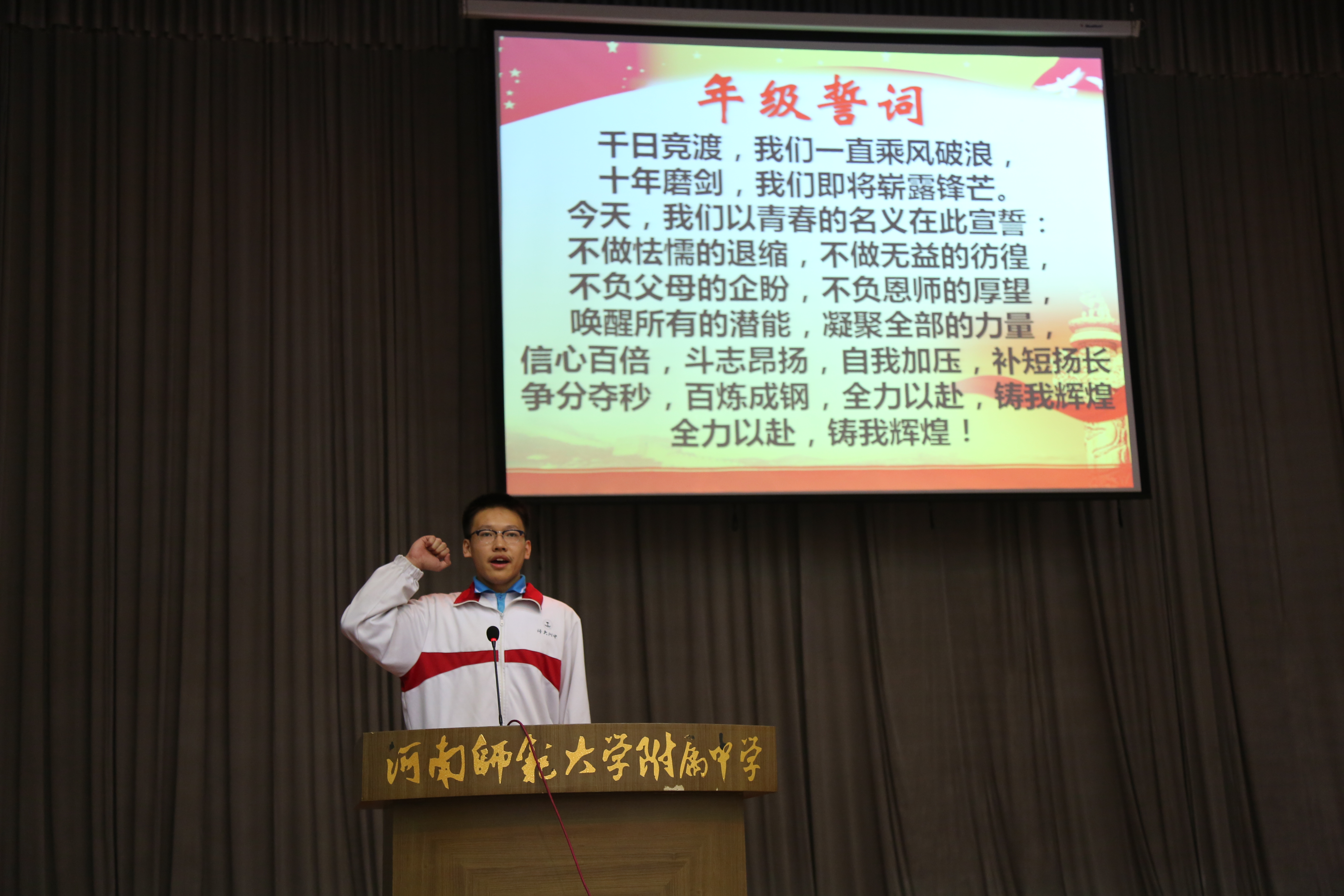 在崔夏锋老师的带领下,与会全体教师进行宣誓。老师们承诺,愿倾己之力,助同学们勇敢前行。老师们的宣誓点燃了同学们心中火热的激情。在王宇轩同学的带领下,全体高三学生震彻云霄的口号和誓言将大会推向高潮。同学们先是按照班级顺序依次呐喊班级口号。大家整齐的动作,嘹亮的口号声传达出他们迎战高考的信念和勇气。“不做怯懦的退缩,不做无益的彷徨”,铮铮誓言回荡在礼堂上空,也回荡在每个孩子心里。这是他们对自己的承诺,对家长的承诺,更是对青春的承诺。他们的真挚、热情感染了在场的每一个人。