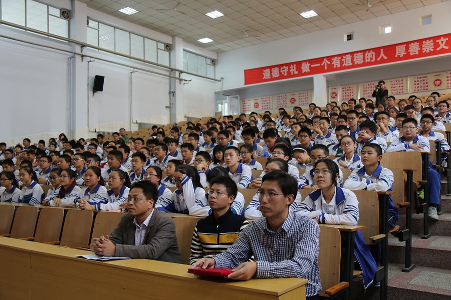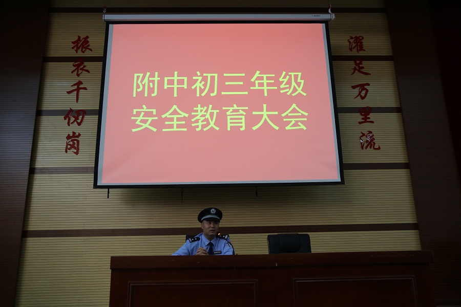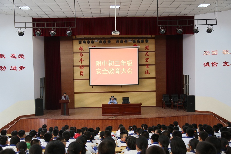 新乡市公安局卫东分局社区警务大队三中队中队长郁艳军、河南师大附中教育教学部主任汪才安、副主任张自发和初三本部年级主任刘晨曦及初三年级本部全体学生参加了此次活动。