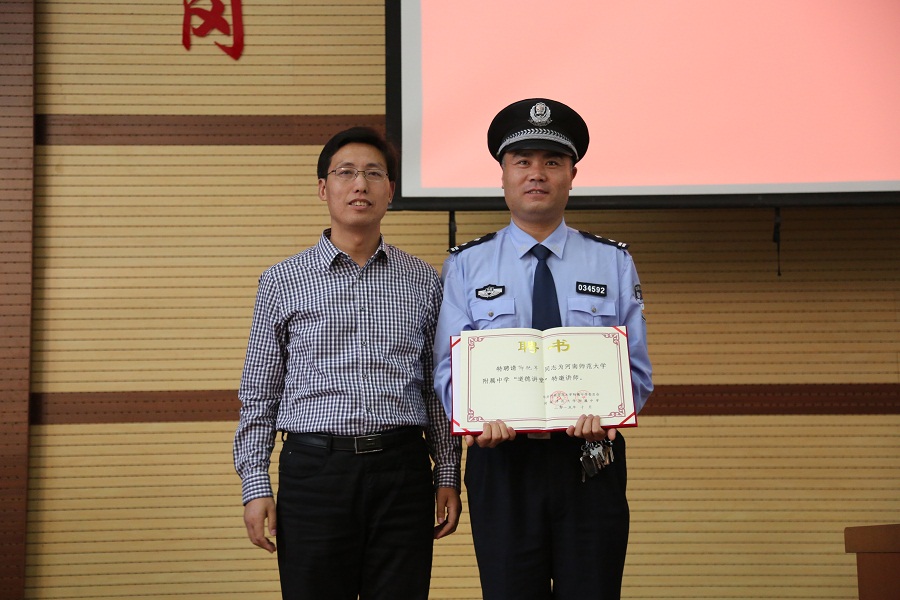 在活动中,附中教育教学部主任汪才安首先为被我校特聘为河南师范大学附属中学“道德讲堂”特邀讲师的郁艳军警官颁发了聘书。