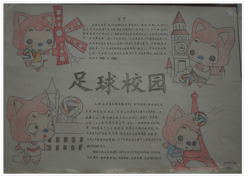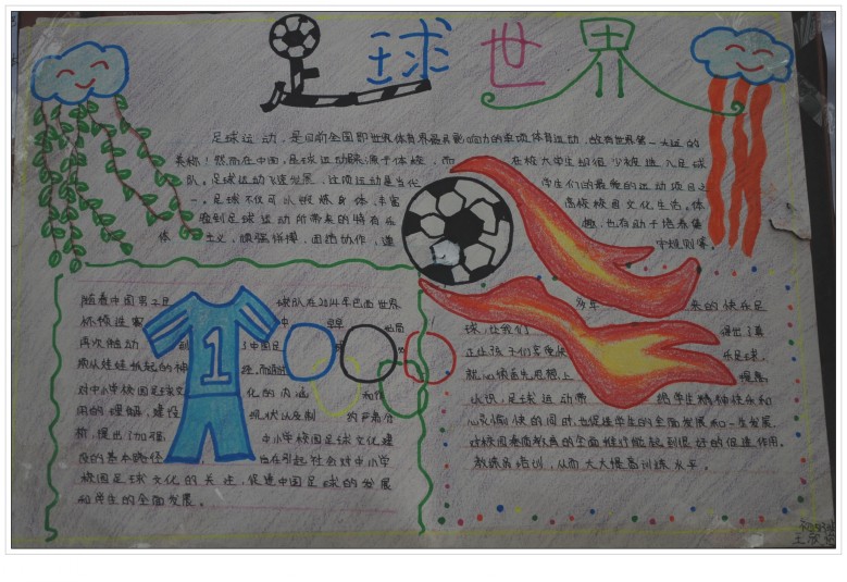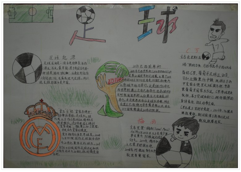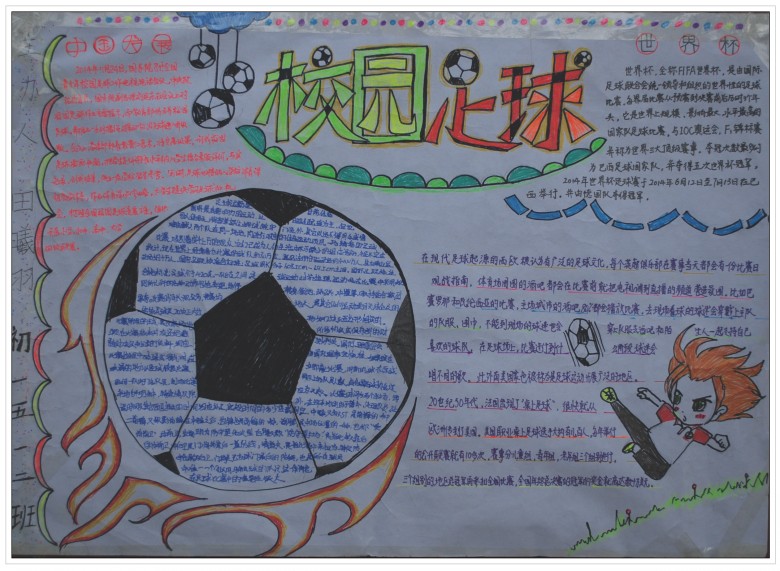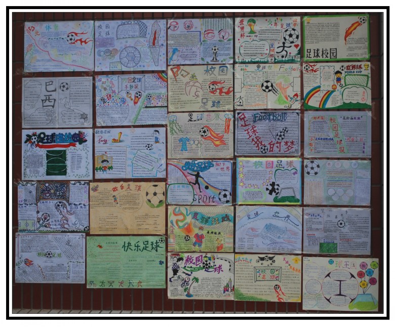 本次足球手抄报比赛全体学生全员参与,人人动手,营造了浓郁的校园足球文化氛围。活动内容丰富多彩、寓教于乐、生动有趣,富有深厚的文化内涵。此次活动体现了综合实践活动的学科综合型,学生将数学(调查统计)、语文(课外阅读、宣传报道)、美术(设计绘画)还有品德与社会(民主决策、制定规则)、体育等学科综合到了一起,让学生的各方面能力都得到了锻炼,不仅聚合、同化学生群体内各种力量,激发学生的合作意识和集体荣誉感,也满足了学生自我实现的激励,综合素质得到提高。