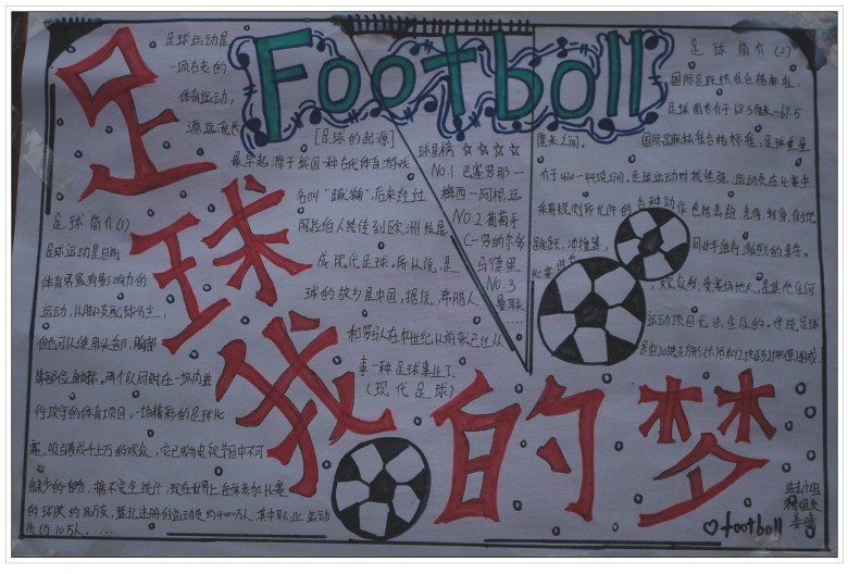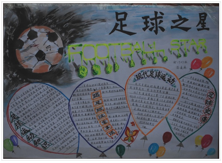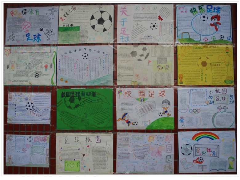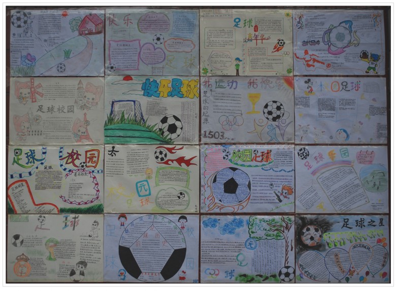 为了响应学校号召,全面落实素质教育的各项政策,丰富学生的足球文化知识,让更多的学生了解足球,热爱足球,并让学生在多姿多彩的美术活动中快乐成长,作为全国青少年校园足球特色学校,河师大附中金龙初一年级在校体育文化节期间举办了以“阳光体育·快乐足球”为主题的手抄报比赛。