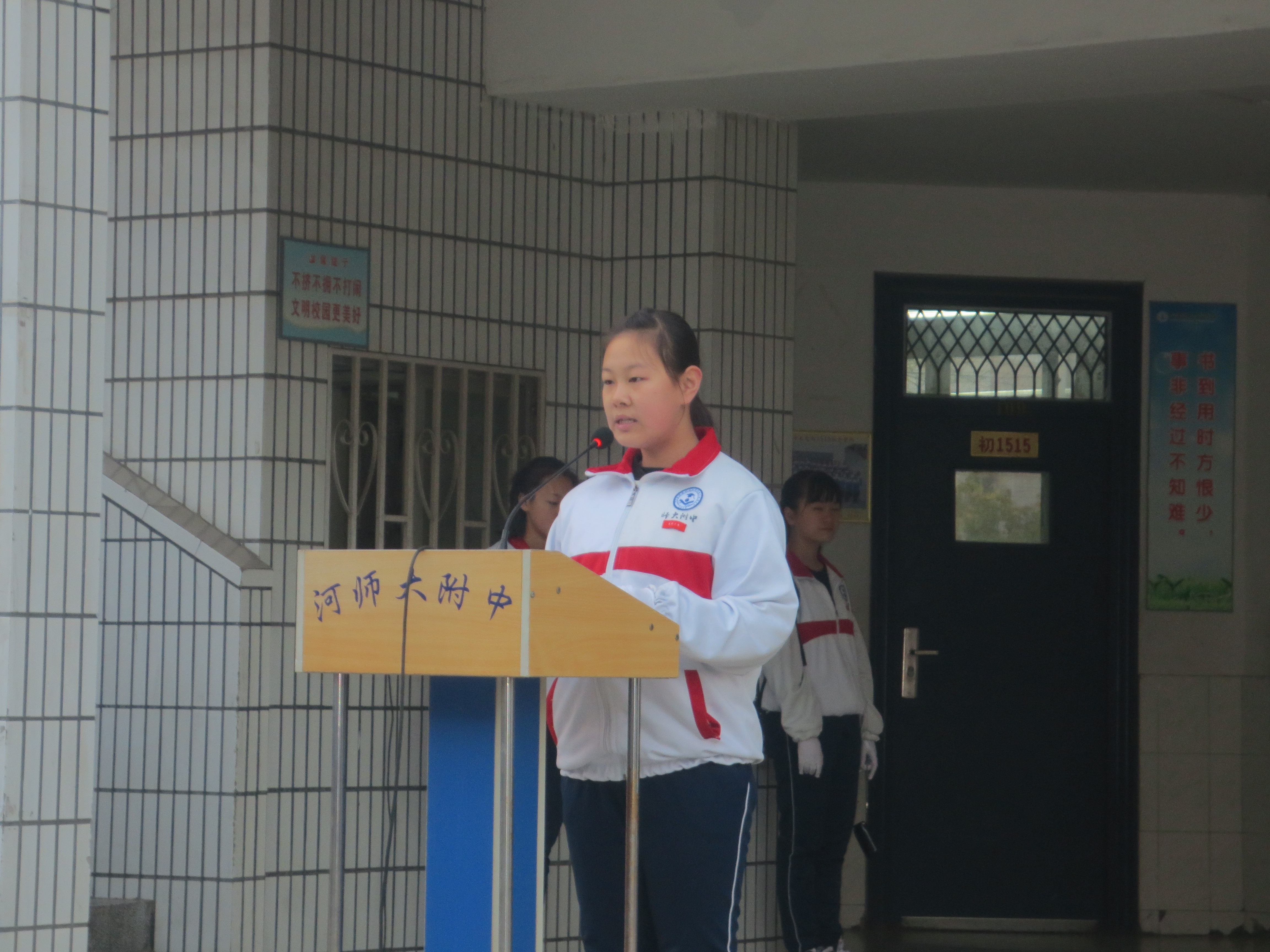 升旗仪式中让人怦然心动的是1401班华朵同学的发言,她从近期全年级开展的学习新修订的《中小学生守则》 出发阐述作为一名初中生学习守则的必要性,并将学习的意义与每一个中学生的“中国梦”密切关联。她的整个发言一气呵成,从一个侧面反映出本部初二年级在德育教育方面取得的成绩。