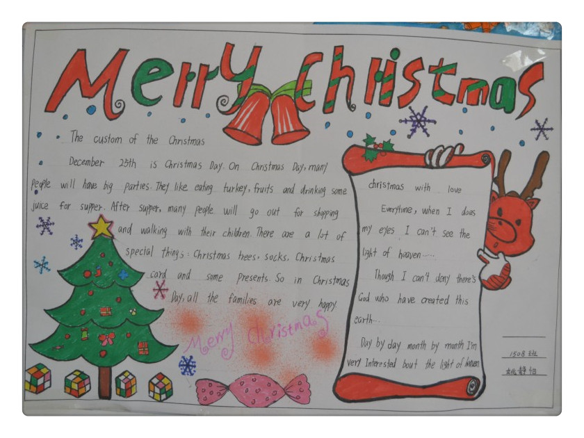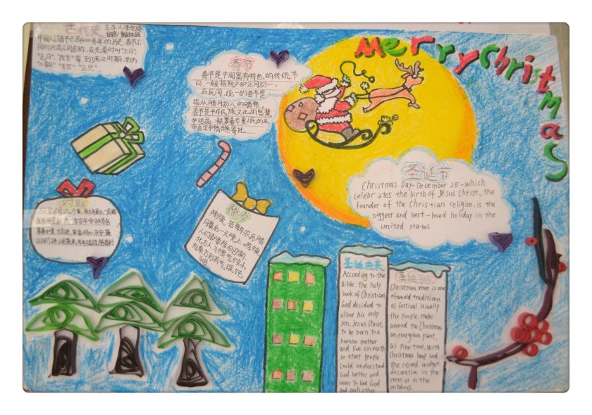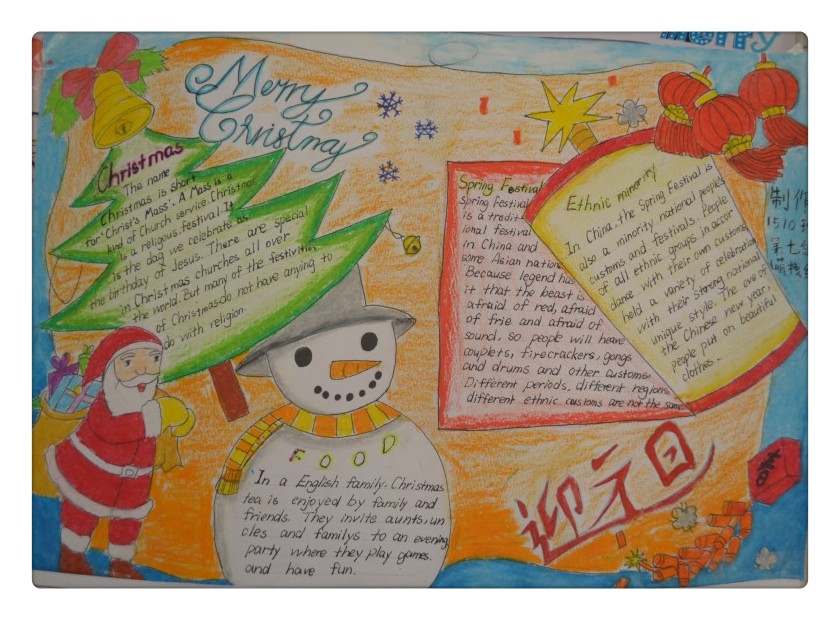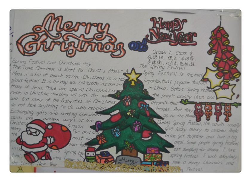 为丰富我年级学生的校园文化生活,营造轻松愉快的学习氛围,激发他们的英语学习兴趣,河南师大附中金龙初一年级英语风采大赛系列活动拉开帷幕。作为此次活动的第一环节,以“Merry Christmas and Happy New Year”为主题的“迎双节英语手抄报比赛”成功举行。