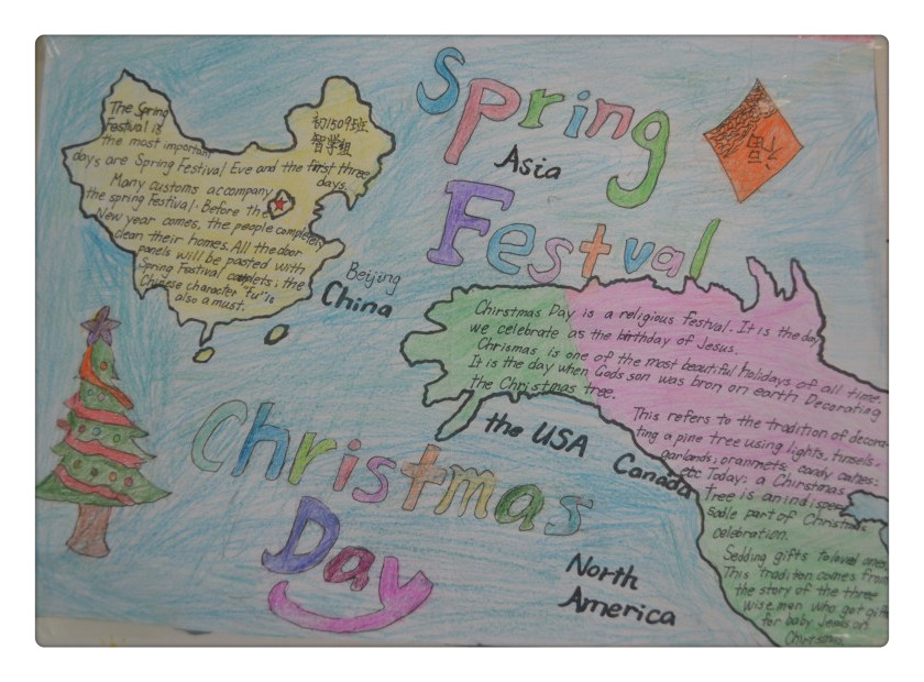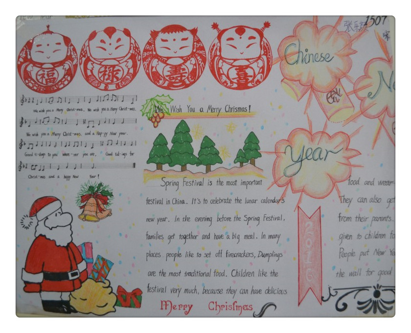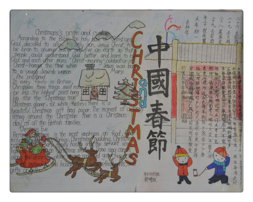 作为一种独特的校园文化活动,英语手抄报比赛能使学生将在外语课堂上所学到的知识,具体运用到实践中去,进而产生学生能力的转换延伸。它把英语的课堂教学、美术的设计绘画、语文的课外阅读等结合在一起运用到了手抄报的制作中,既培养了学生英语学习的浓厚兴趣,又使他们在潜移默化之中,提高了对以“春节”为代表的中国传统文化的修养。
