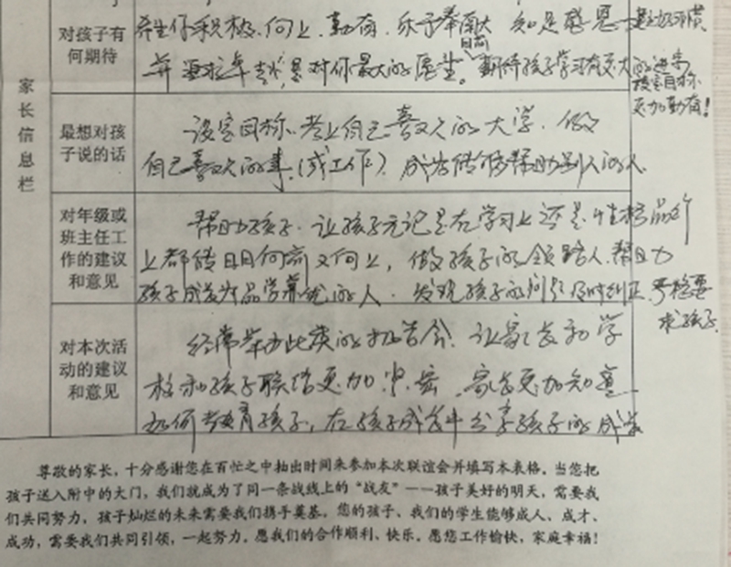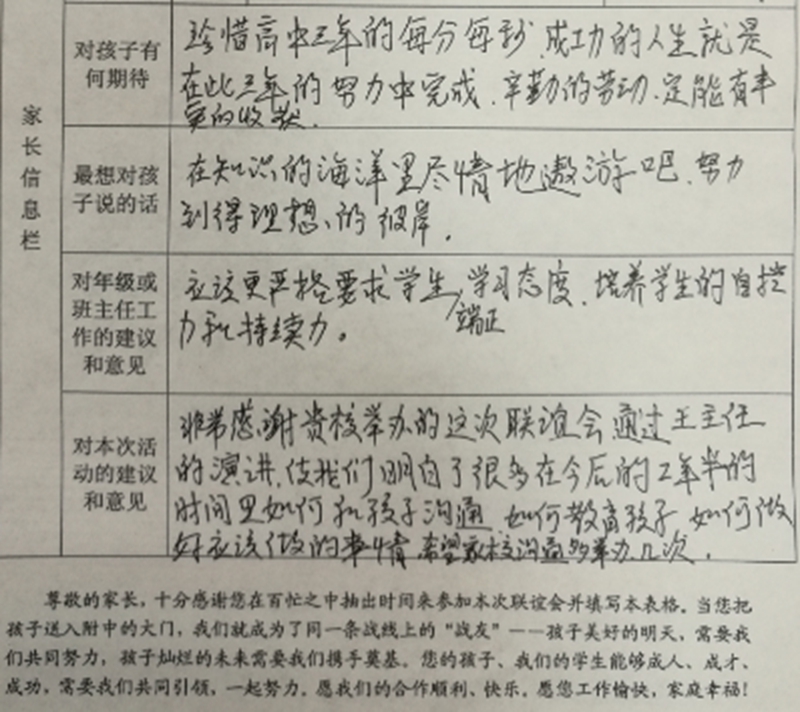 在本次家校联谊会过程中,年级部还发放、收回了《家校沟通卡》,真诚地希望家长能够提出宝贵意见和建议。据悉,金龙高一年级部已对家长反映的建议和意见进行分类整理,真正发挥家校合力的作用,把好的意见和建议落到实处。