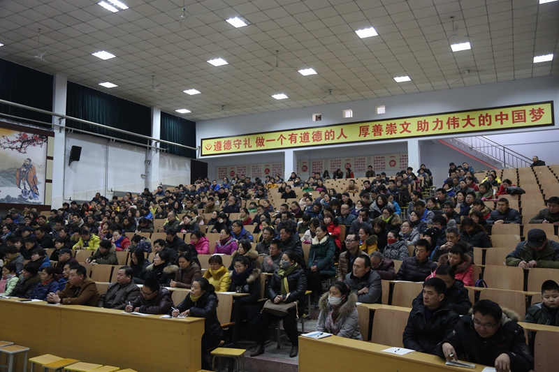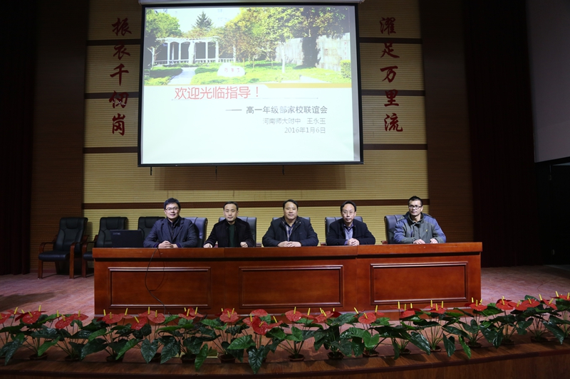用心凝聚理解的翅膀,用爱架起沟通的桥梁。为了发挥家庭、学校教育孩子的合力,更好地促进学生的成长、成才,河南师范大学附属中学金龙学校高一年级部于2016年1月16、17日分两次举行家校联谊会。河南师范大学附属中学副校长赵振华、河南师范大学附属中学金龙高中部主任刘新选、河南师范大学附属中学金龙高中部副主任郭卫强、金龙高一年级部全体级班主任、金龙高一年级家长共700余人参加了本次家校联谊会。