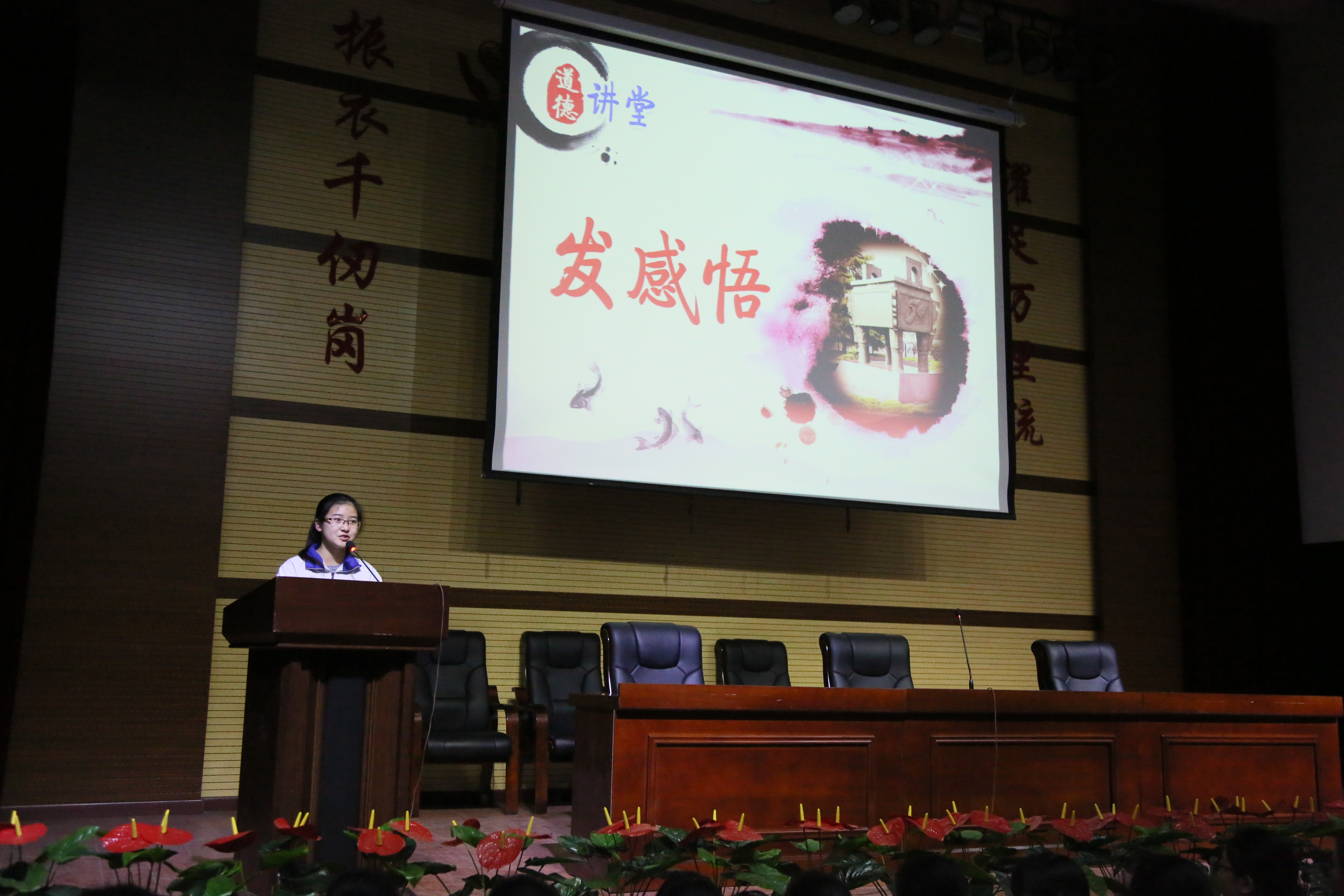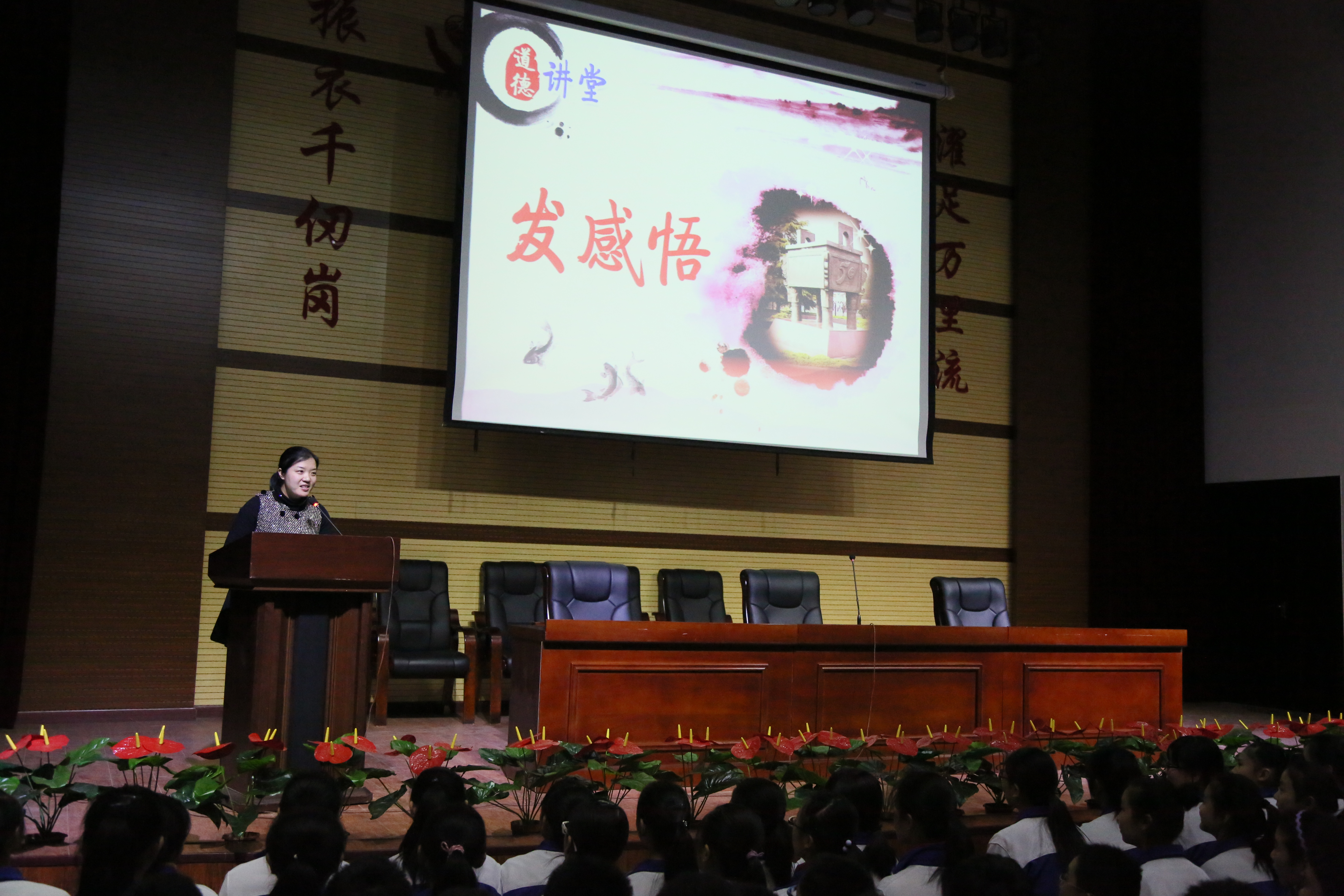 反思完毕,全体老师和同学继续保持肃立状态。进入活动第二个环节:唱道德歌曲《中学生守则之歌》。伴随着金龙初二年级学生课堂内外活动照片的展播,全体学生精神充沛、激情歌唱,抒发强烈的自豪之感,使在场的每位师生都热血沸腾,奠定了本期活动的情感基调。