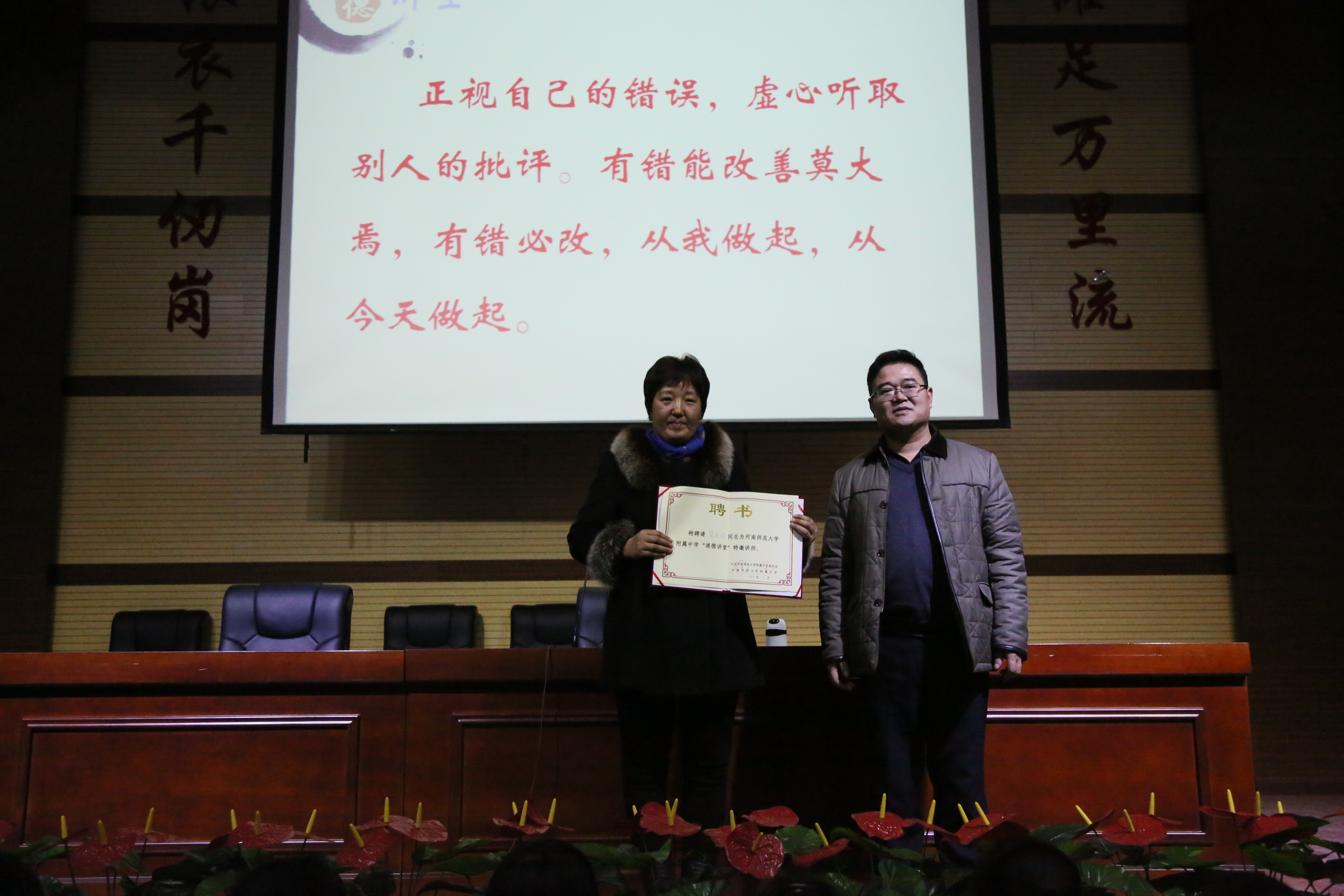 在“讲道德故事”环节中,全体师生共同观看了视频故事《闻过则喜》,接着由中学高级教师、新乡市青少年活动中心特邀心理咨询师崔连玲老师做了《正视自己的错误,虚心接受批评》的讲座。讲座分为如何对待自己的错误和如何对待别人的批评两部分,讲座中既有理论介绍,又列举了李天一、魏征等事例,对学生进行了深刻的道德教育。在整个讲座过程中,崔老师语言生动,道理深入浅出,事例贴近生活,不时赢得阵阵掌声。讲座结束后,我校常务副校长刘齐晋代表学校给崔老师颁发“河南师大附中道德讲堂讲师”聘书。马帅老师和戴琰同学作为师生代表登台发表自己的感悟。