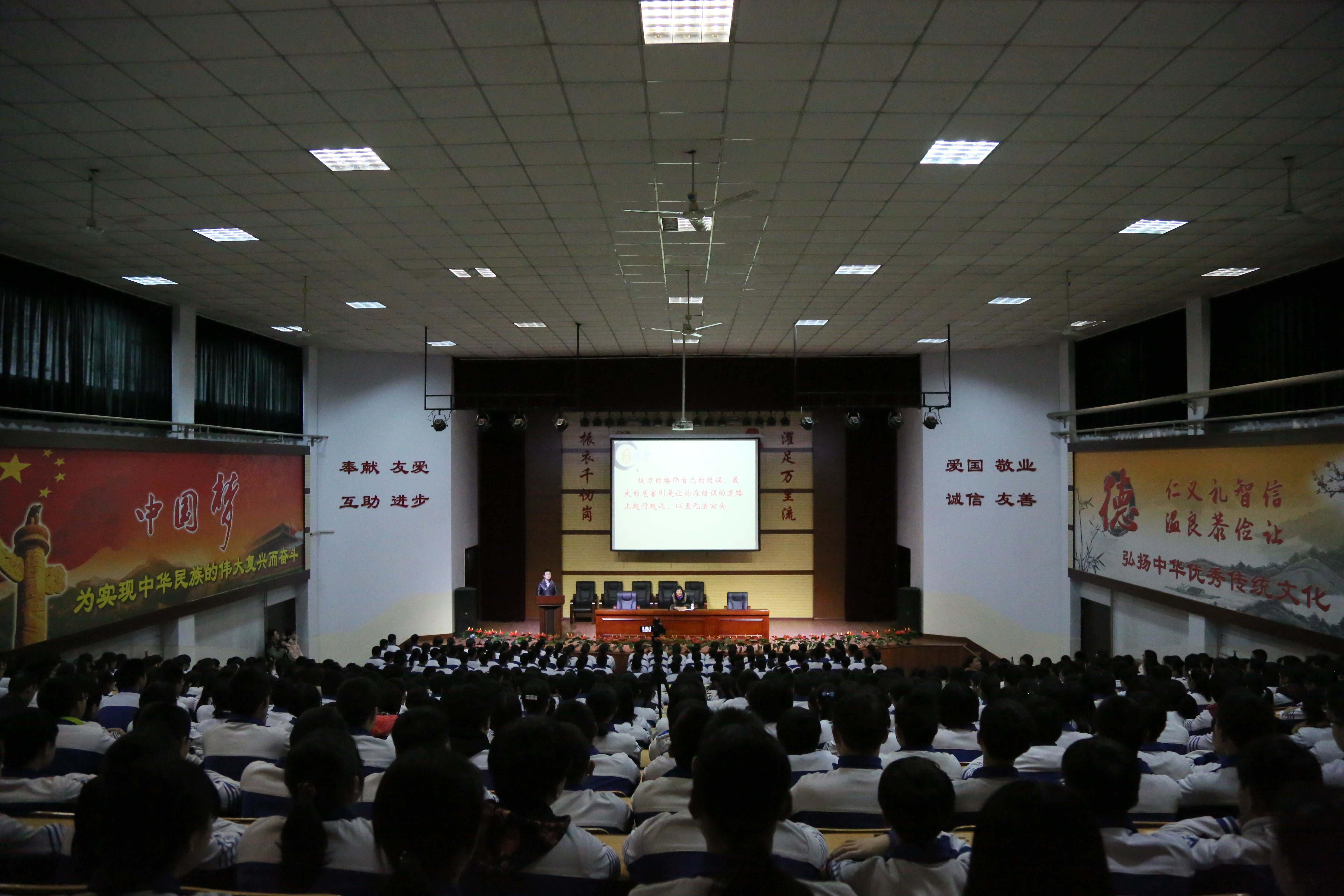 我校第二十六期道德讲堂活动于1月15日和1月18日分两场在逸夫科技馆道德讲堂报告厅开讲,本期道德讲堂主题为“闻过则喜,知错必改”,由金龙初二年级负责承办。我校常务副校长刘齐晋、学部主任陈景任、校团委书记杨呈杰及学部副主任都温中等领导与初二年级一千四百余名师生共同参与了此次活动。本期活动由范楷老师主持。