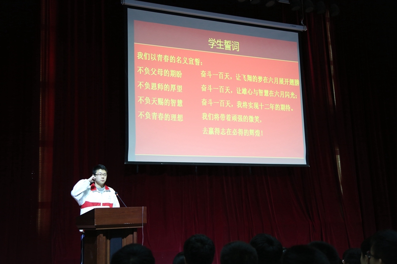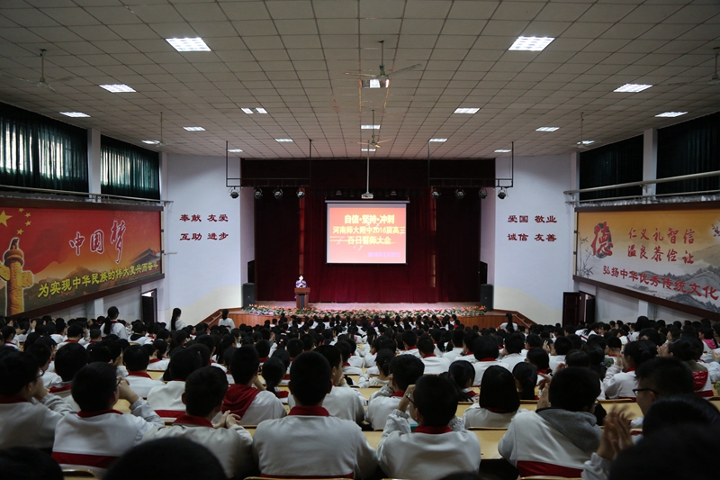 誓师大会上,首先播放了以班级教学团队为单位录制的为高考鼓劲加油的视频。老师们饱满的情绪、昂扬的斗志感染着在座的每一位学生。同学们以整齐、洪亮的口号声向老师们表明自己的决心和勇气。在高1305班学生代表李浩宇同学的带领下,全体高三学生庄严而自信的宣誓,道德讲堂里回荡着一阵又一阵激动人心的喊声,场面恢宏壮观。 高三年级级主任任志福从充满信心,勇往直前;坚忍不拔,奋发努力;心态平和,坦然面对三个方面对同学们提出明确要求。并寄语所有同学们,希望在最后的一百天里,大家变压力为动力,变决心为信心,变誓词为行动,扬鞭策马,发愤图强,百日冲刺,谱写附中高考新篇章。 刘校长结合中外名人故事,对“自信,坚持,冲刺”三个关键词进行生动形象的解说。要求同学们在人生道路上,在高考备考中,要相信自己、坚持不懈、奋力冲刺,要将充实的行动附着在虚渺的时间上,把握时间,充实自我,完美人生。最后刘校长向不辞劳苦、辛勤工作的全体高三教师表示深深的敬意和衷心的感谢。 “百天健步登金榜,六月豪情夺桂冠。”百日冲刺誓师大会春雷声震、东风劲催,昭示着河南师大附中又一个桃丰李盛的收获季节即将到来。这次百日冲刺誓师大会的召开为决战百日后的高考营造了浓厚的备考氛围,为今年高考的冲刺和决胜鼓舞了士气,奠定了基础,也必将对我校2016年高考取得成功起到积极的促进作用。