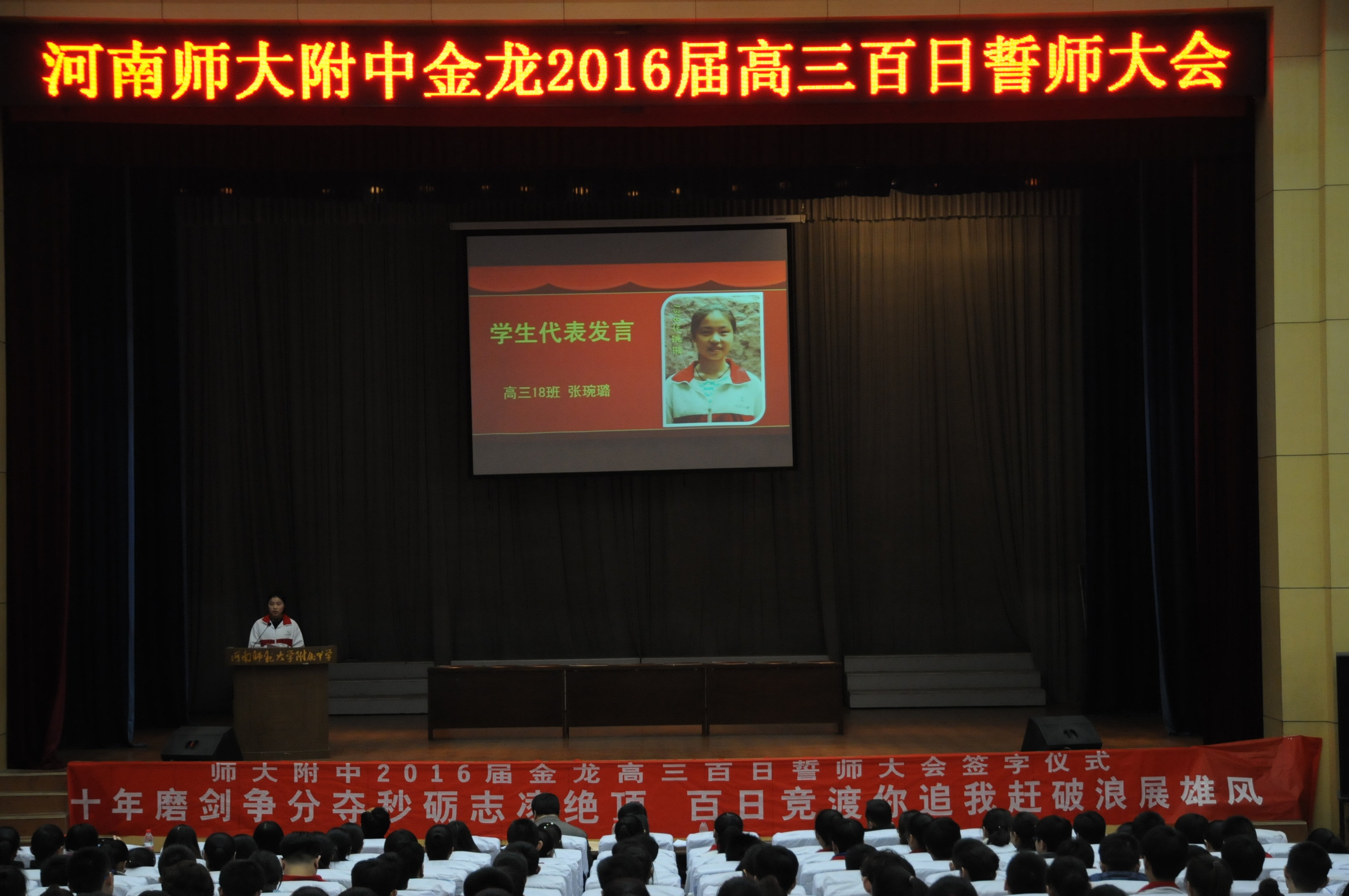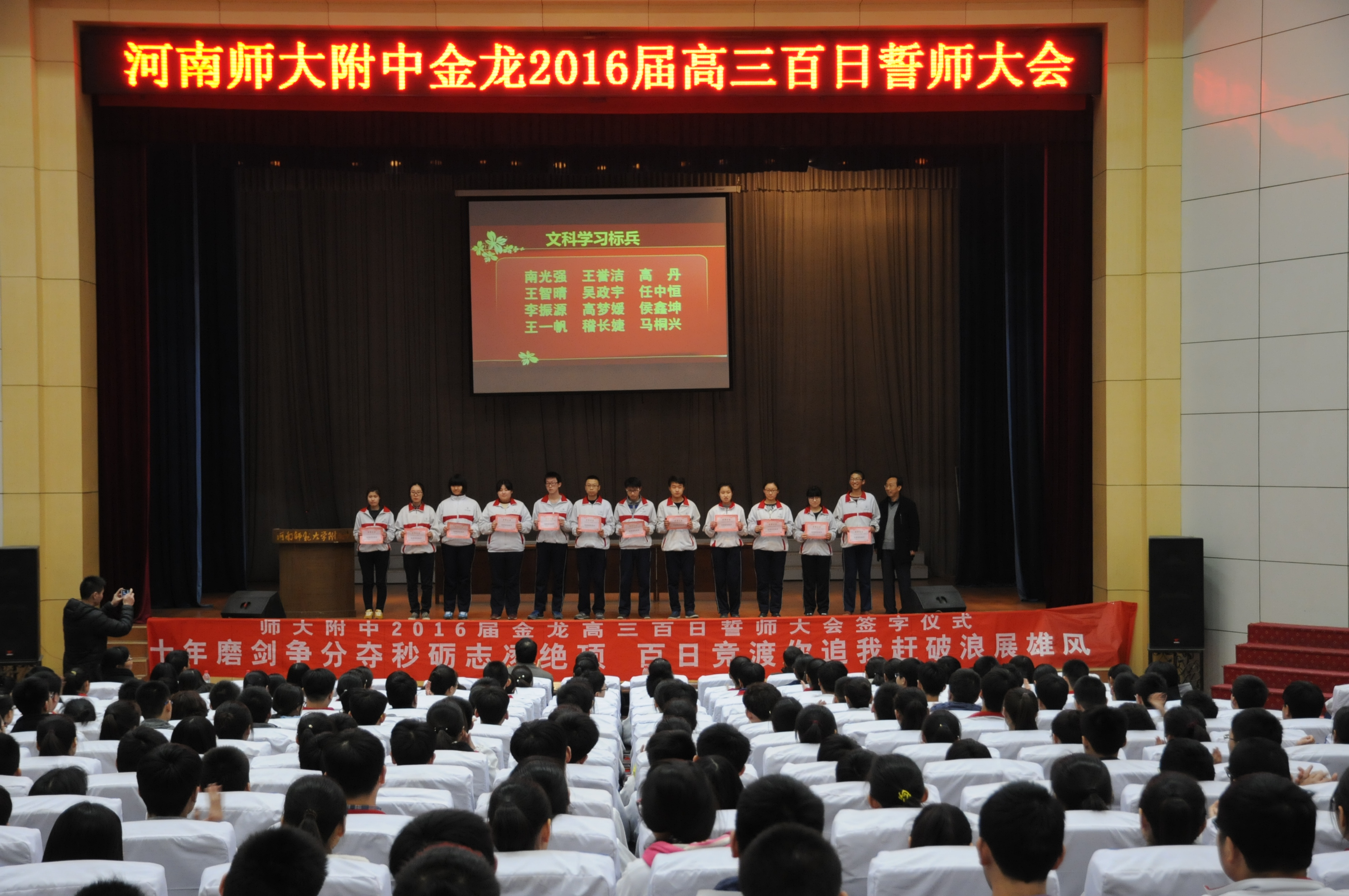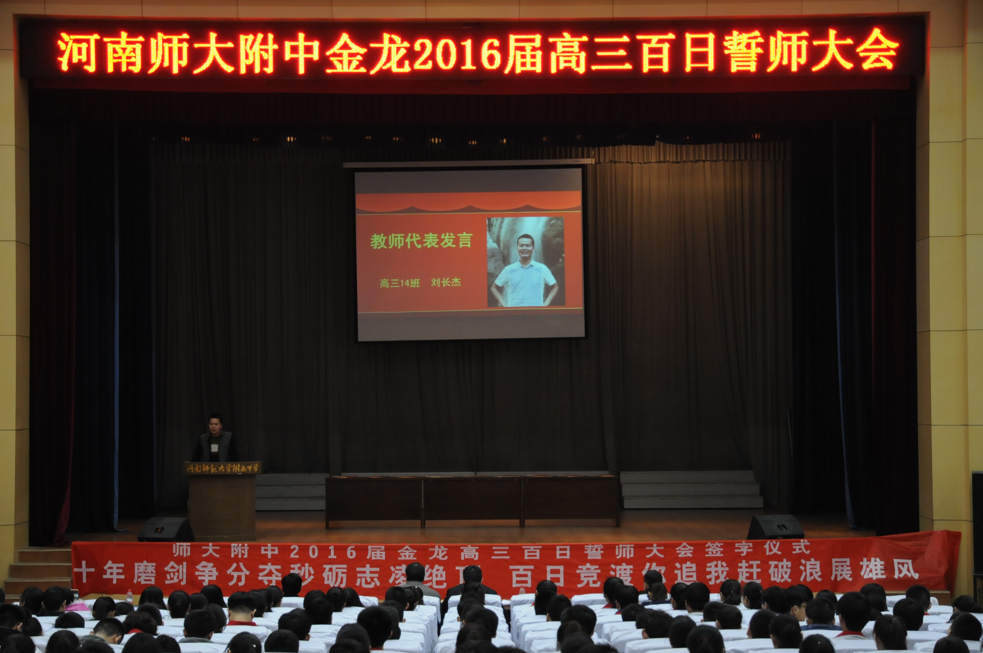 2月27日下午,我校西区礼堂内掌声雷动,座无虚席。2016届金龙高三年级综合表彰暨百日誓师大会在此隆重举行。与会的领导有河南师大附中校长刘黎、副校长赵振华、金龙教育教学部主任刘新选、副主任郭卫强。参加会议的还有金龙高三全体师生。