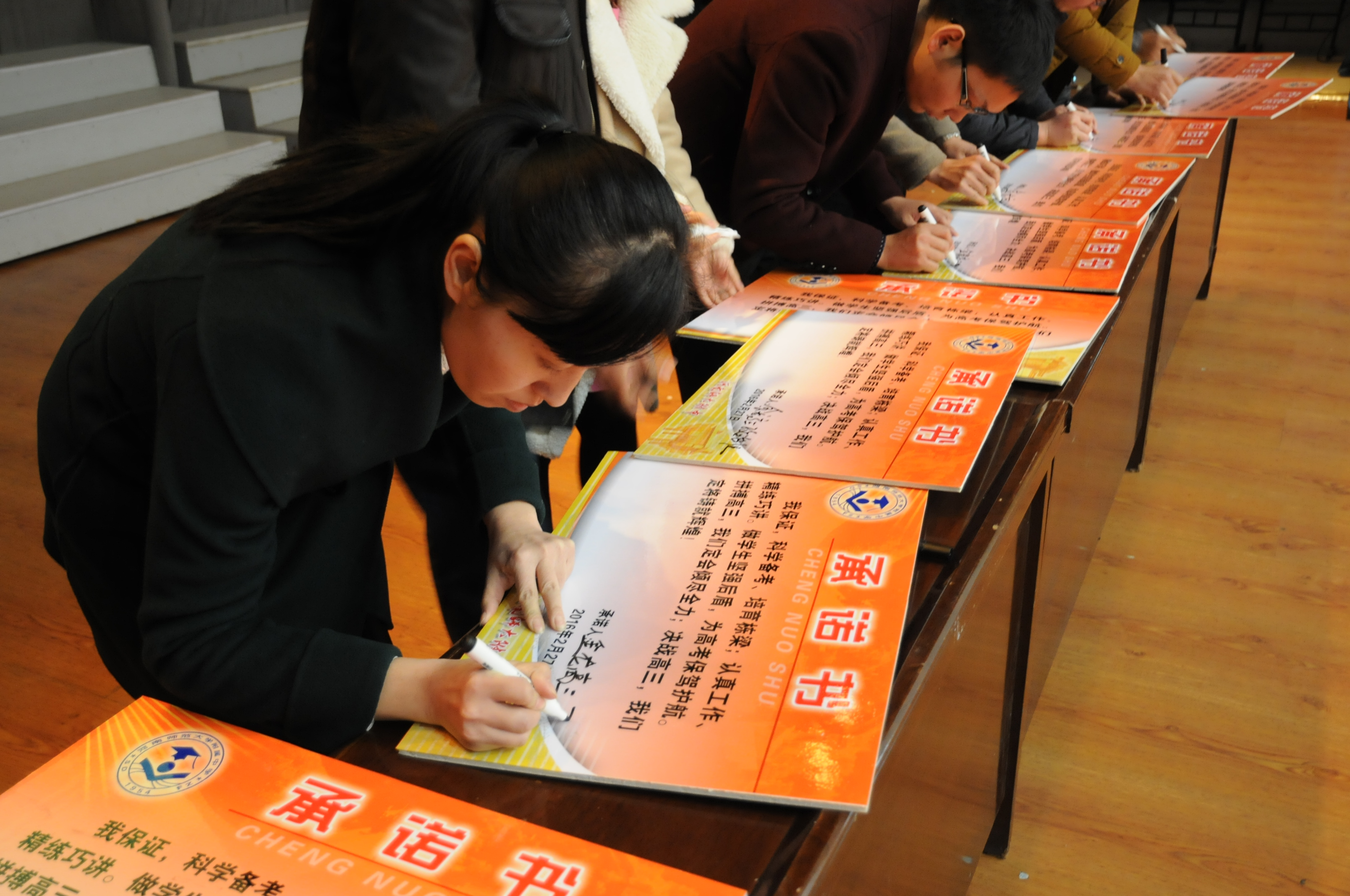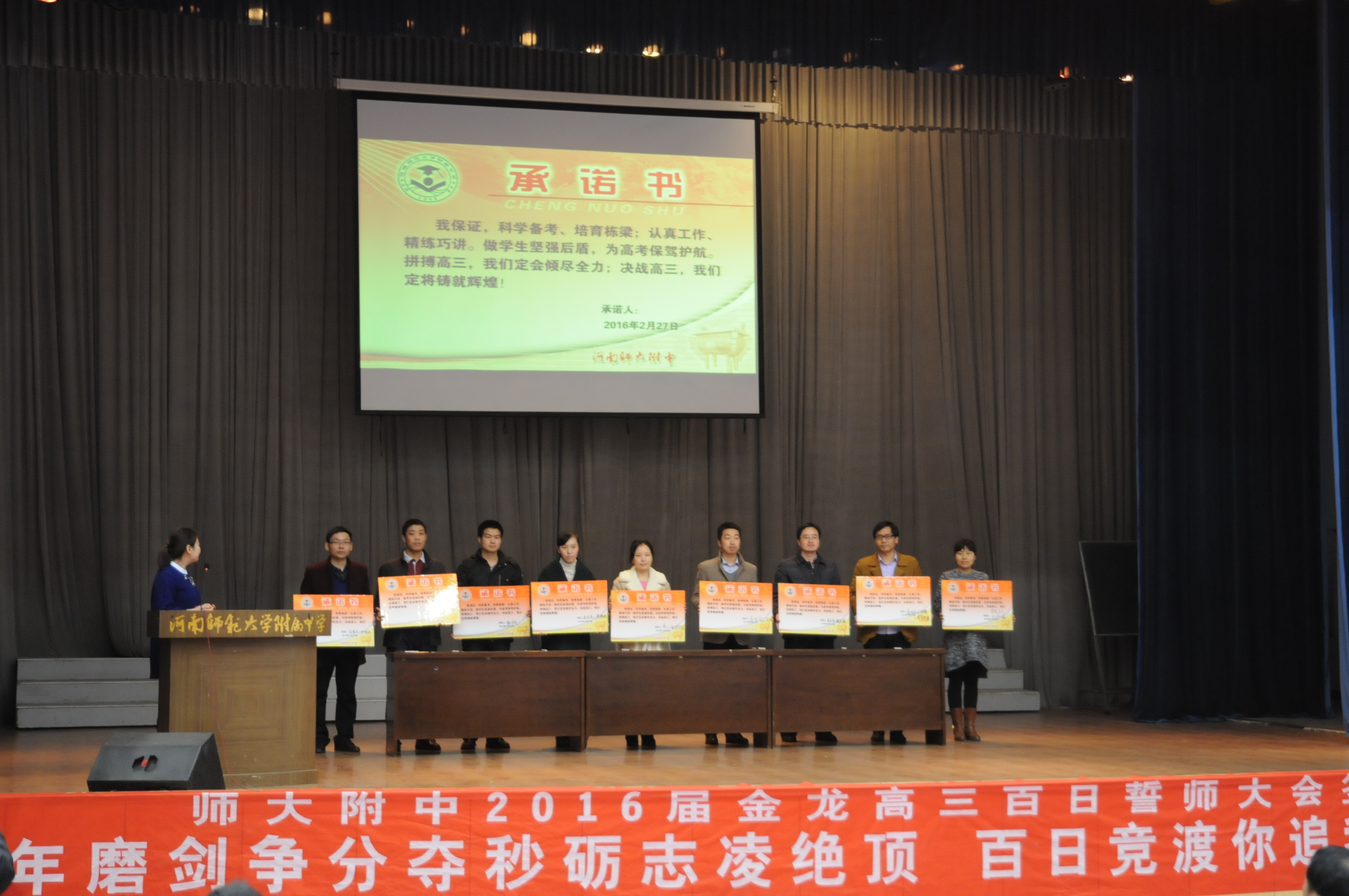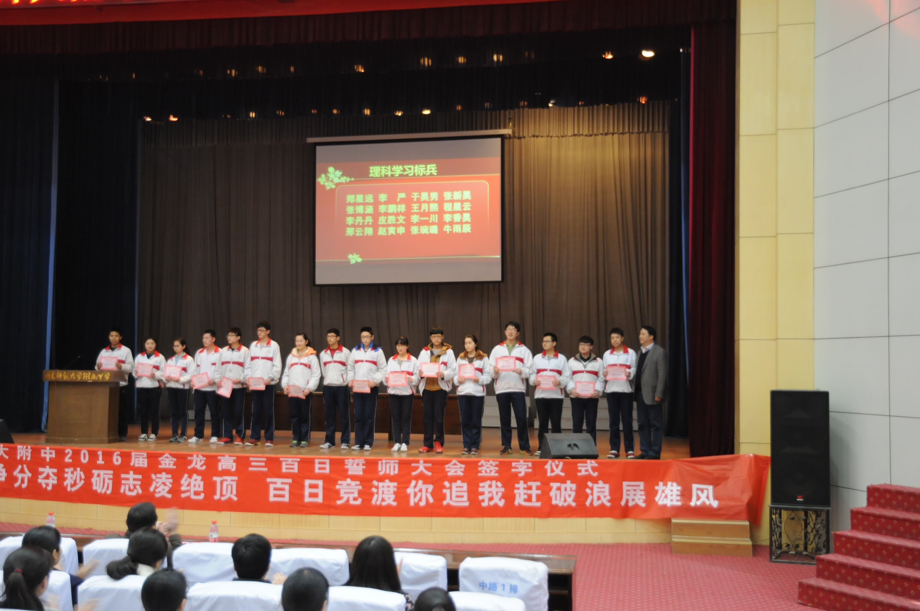 大会开始之前,全体师生观看了2015届优秀学生代表精心制作的VCR,这些VCR表达了上届附中学子对2016届同学们的衷心祝福。接着,大会在雄壮的国歌声中拉开帷幕。首先由赵校长、刘主任分别宣读了理科学习标兵名单与文科学习标兵名单。接着,学生代表张婉璐发言,她表示会在最后冲刺高考的关键时刻坚定信念,顽强拼搏,全力以赴地迎接高考。刘长杰老师代表高三全体教师以饱满的热情、昂扬的斗志来鼓励同学们要自信无畏地迎战高考,也充分表达了老师们会和同学们一道并肩作战、风雨同舟的决心。在签订并宣读承诺书这一环节,金龙高三各学科组教师代表在承诺书上签字表态,现场掌声不断,气氛热烈。这项议程给予了高三年级全体师生充足的信心,并表达了师生在面对高考这场大决战的勇气。在这种热烈的气氛下,全体学生带着激动的心情进行了庄严宣誓。随后,刘黎校长作总结发言。刘校长既对大会给予了肯定,又对同学们在冲刺百日的过程中提出了要求和希望。刘校长的讲话让金龙高三全体师生对高考有了更加清晰的认识,深切鼓舞了师生们的士气。最后,全体师生参加了百日誓师签名仪式并在条幅上签名表决心。